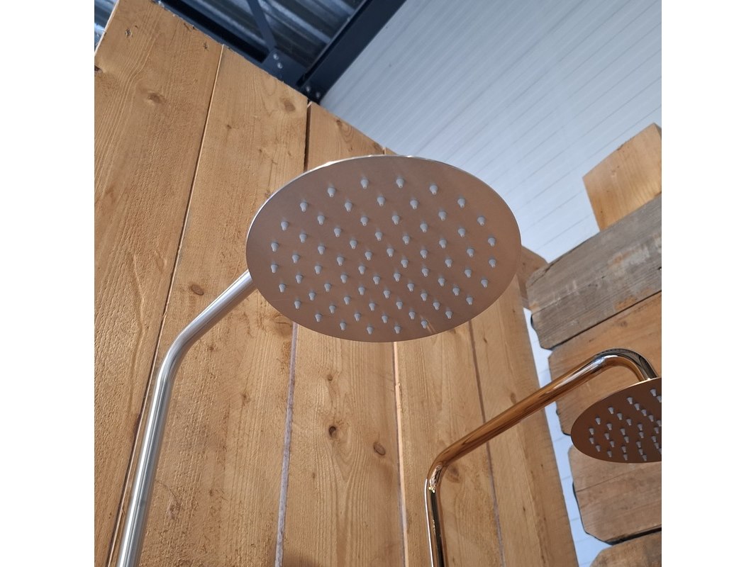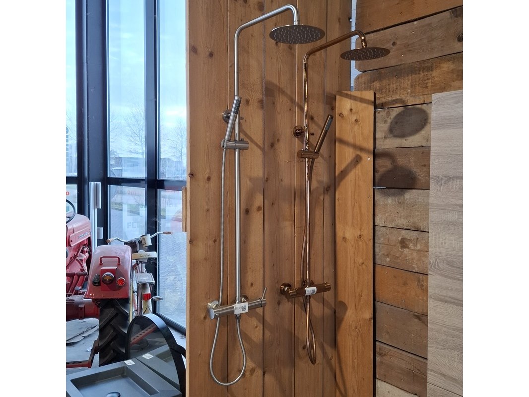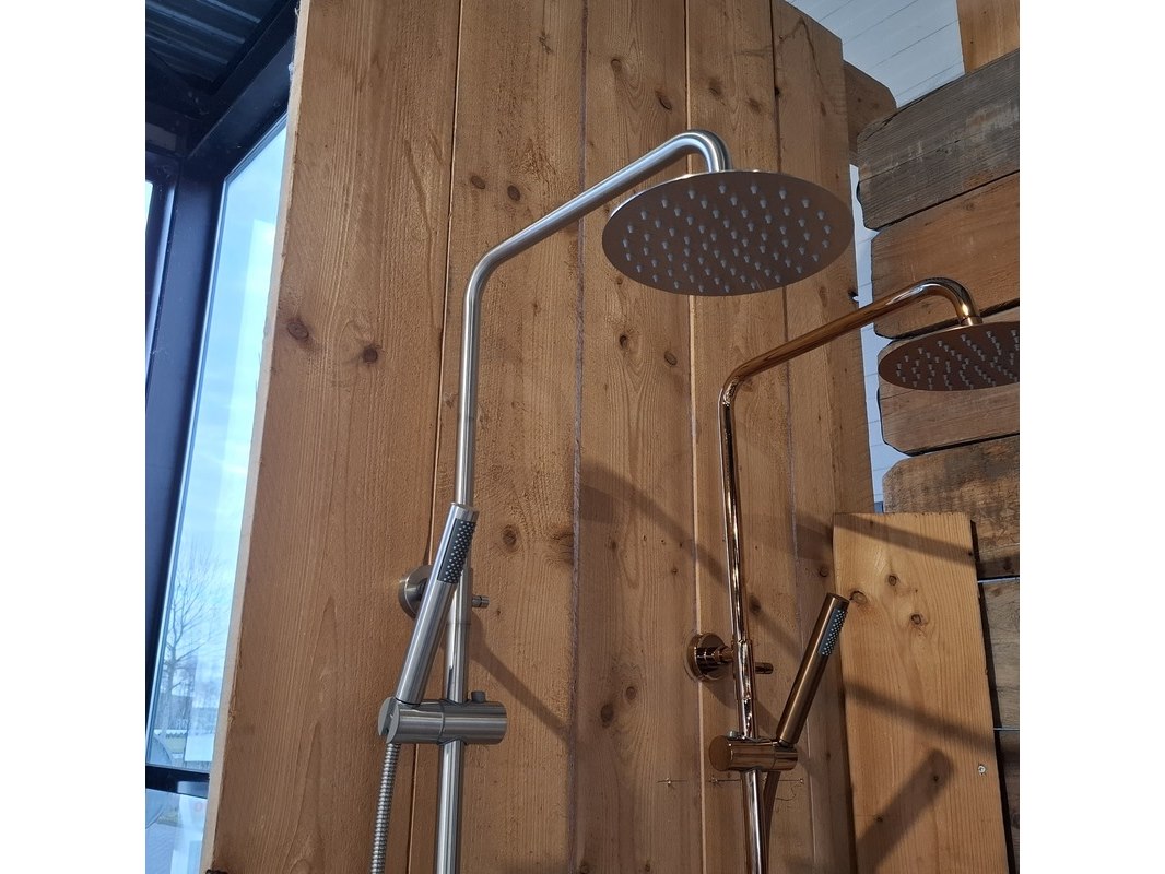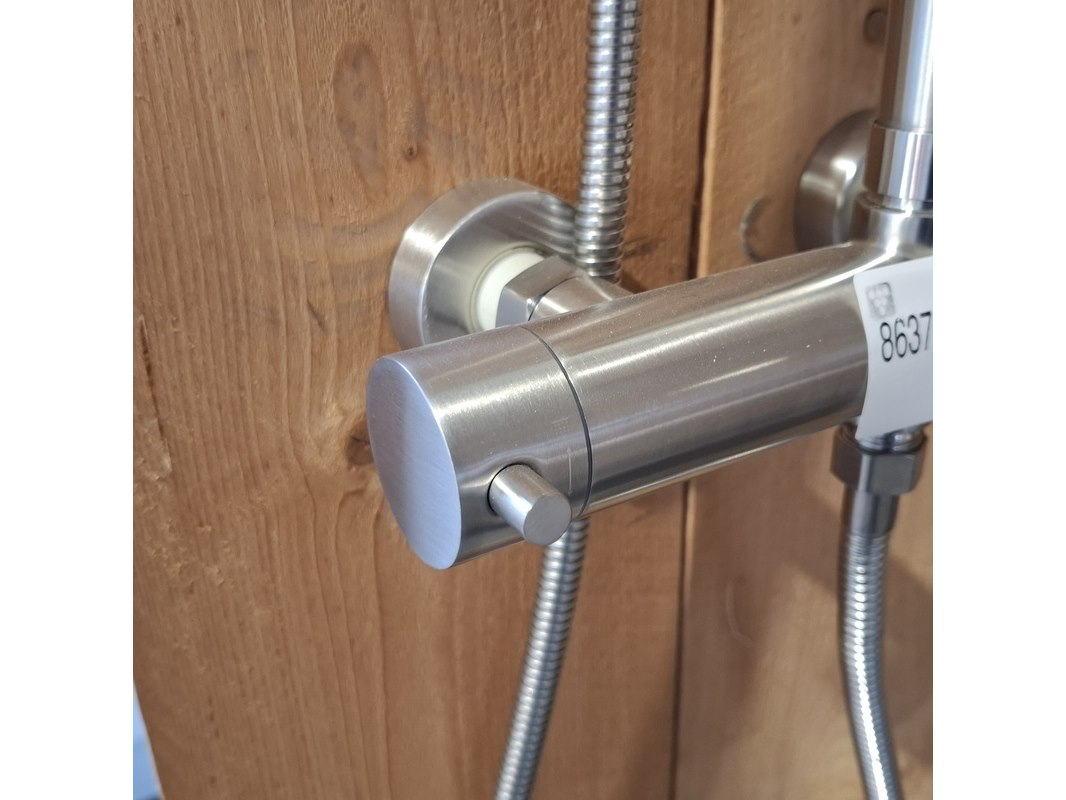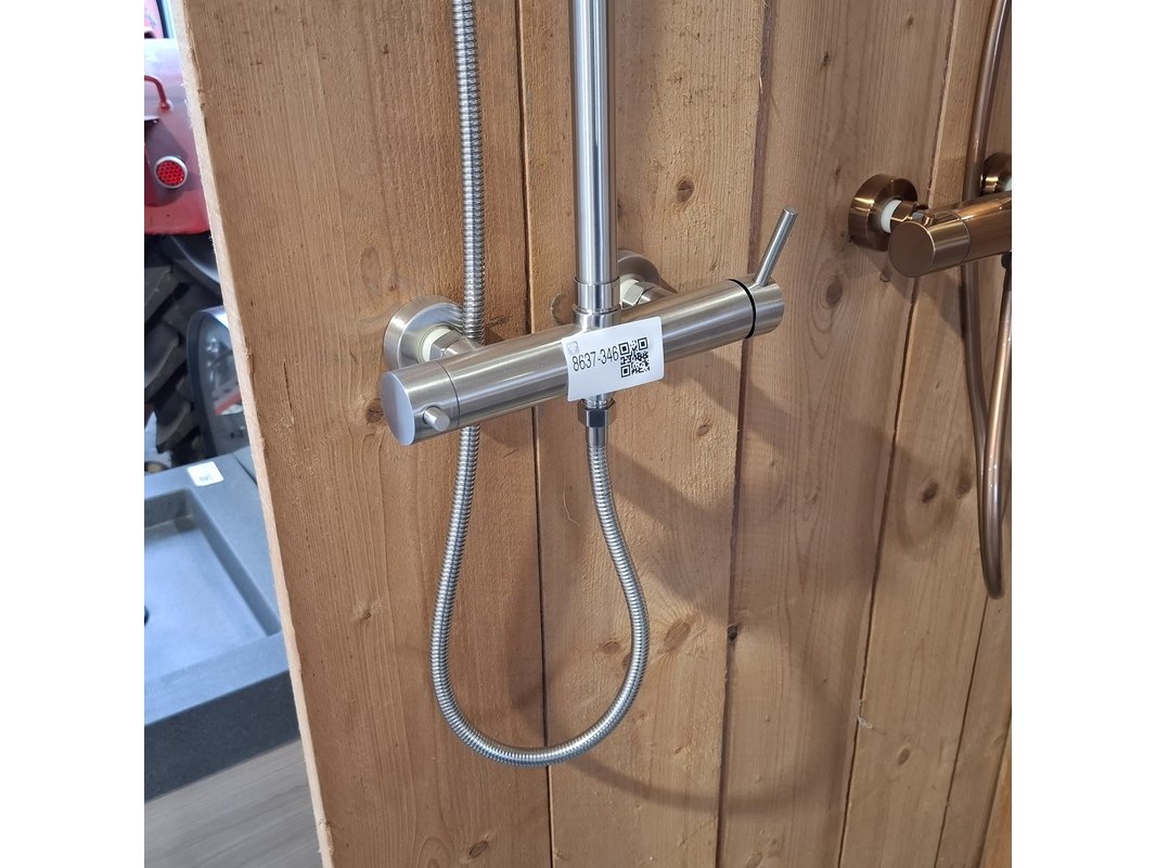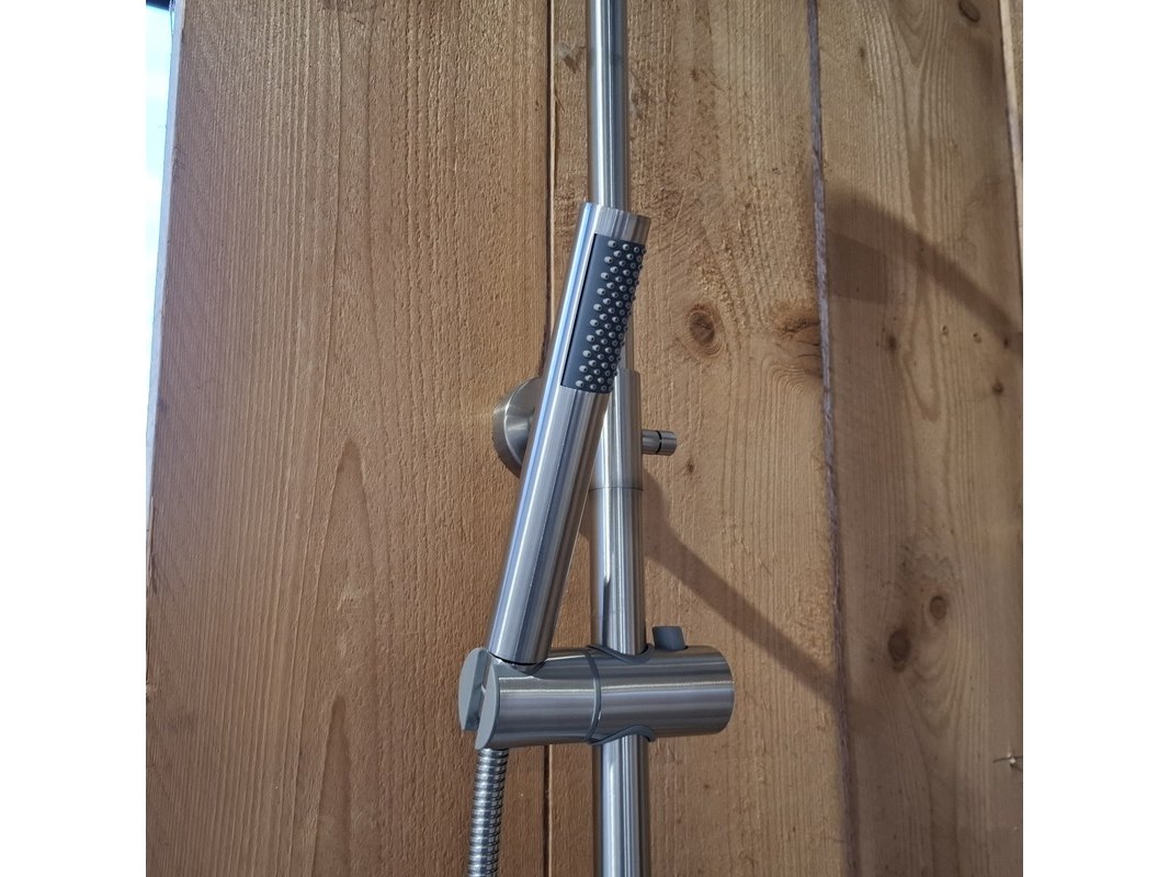 Product: Regendoucheset Kleur: RVS geborsteld Specificaties: set: douchekraan, HOH=150mm, hoofddouche (hoogte instelbaar), met easy clean, staafhanddouche, doucheslang, handdouchehouder, incl. S-koppelingen,incl. rozetten