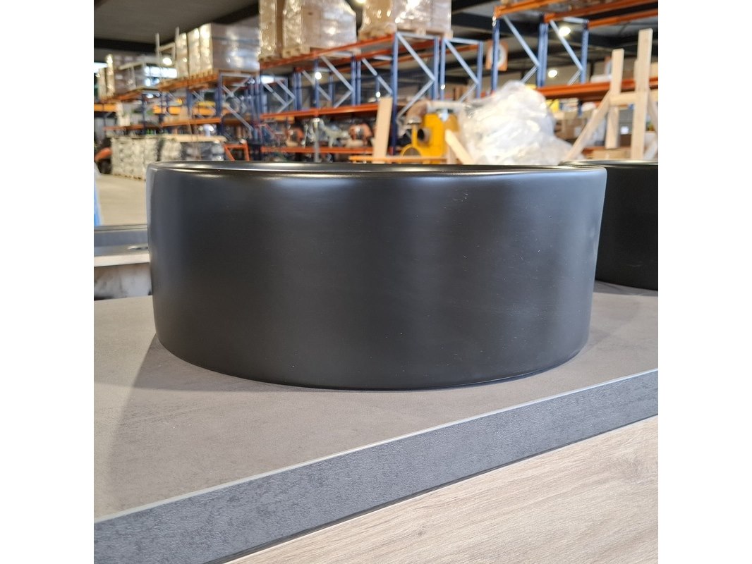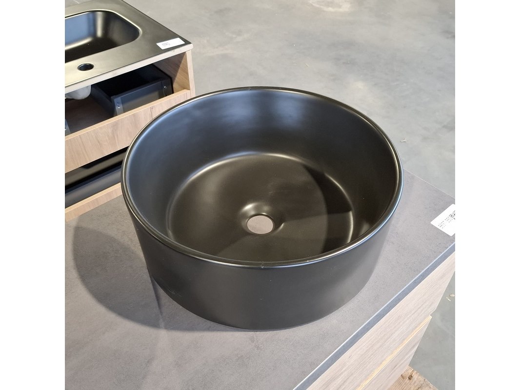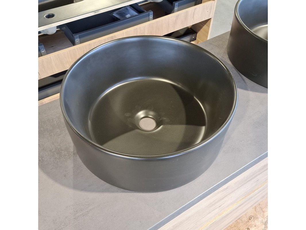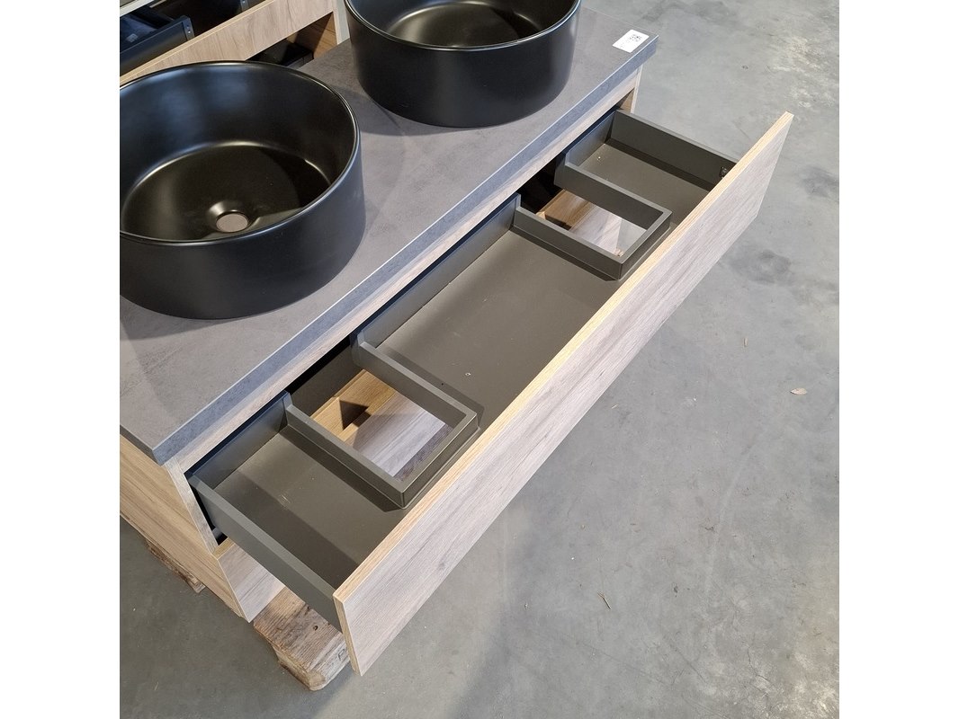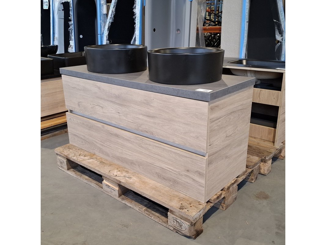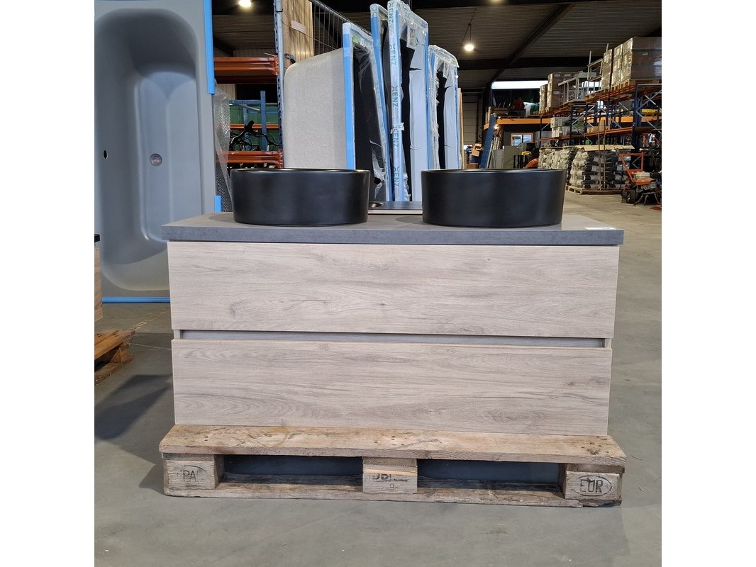 Merk: Solar Product: Badmeubel Kleur: Eiken Afmeting: 120x46cm Specificaties: 2 lades met softclose, greeploos, topblad, antraciet, 2x waskom, Ø40cm, keramiek, mat zwart