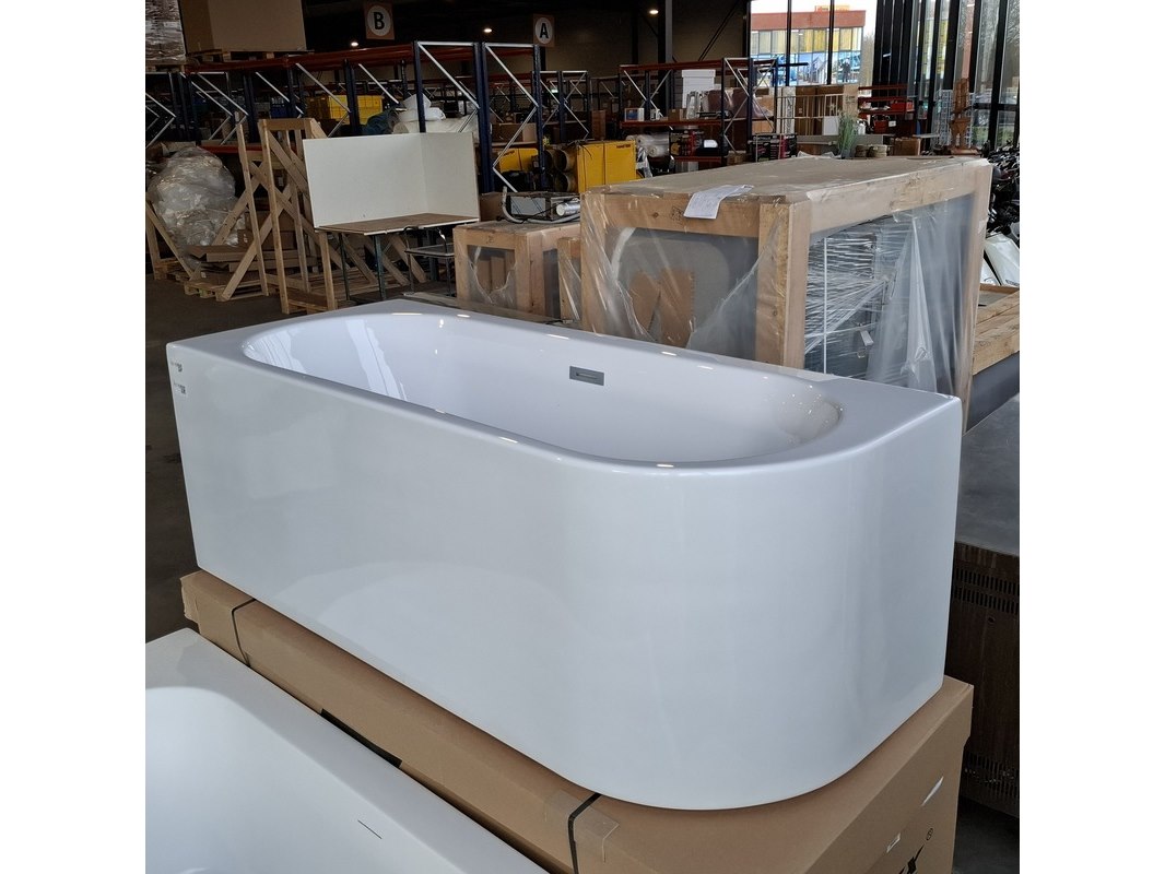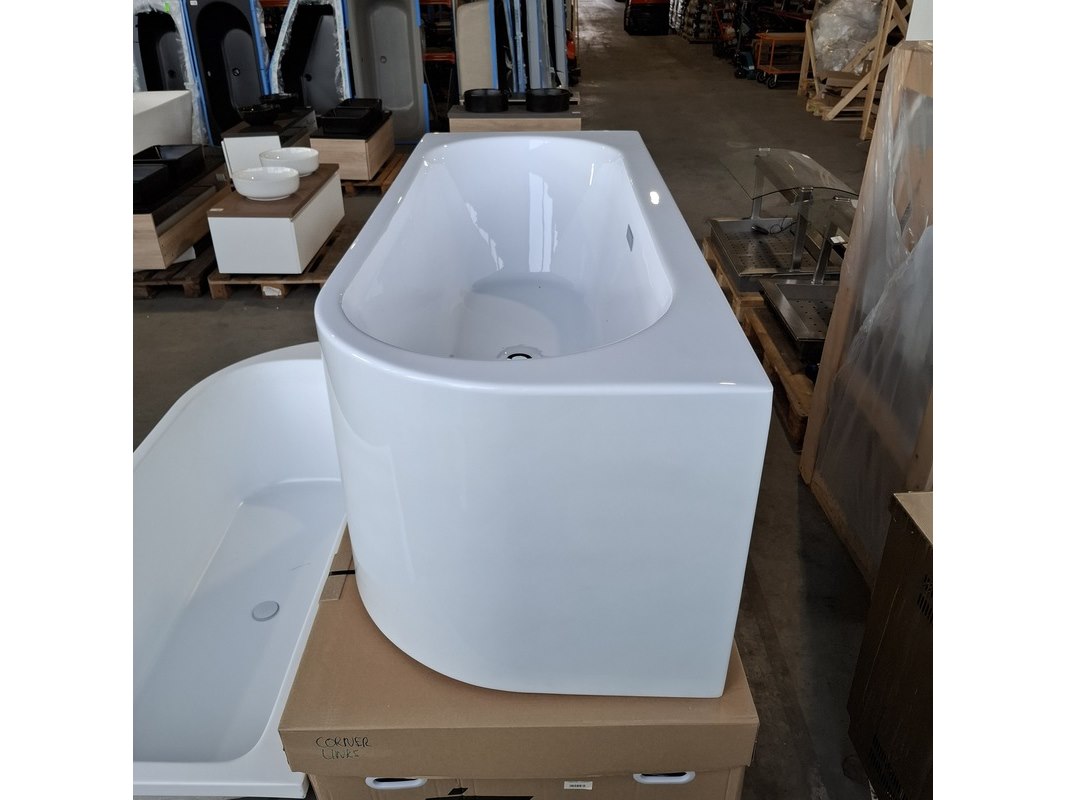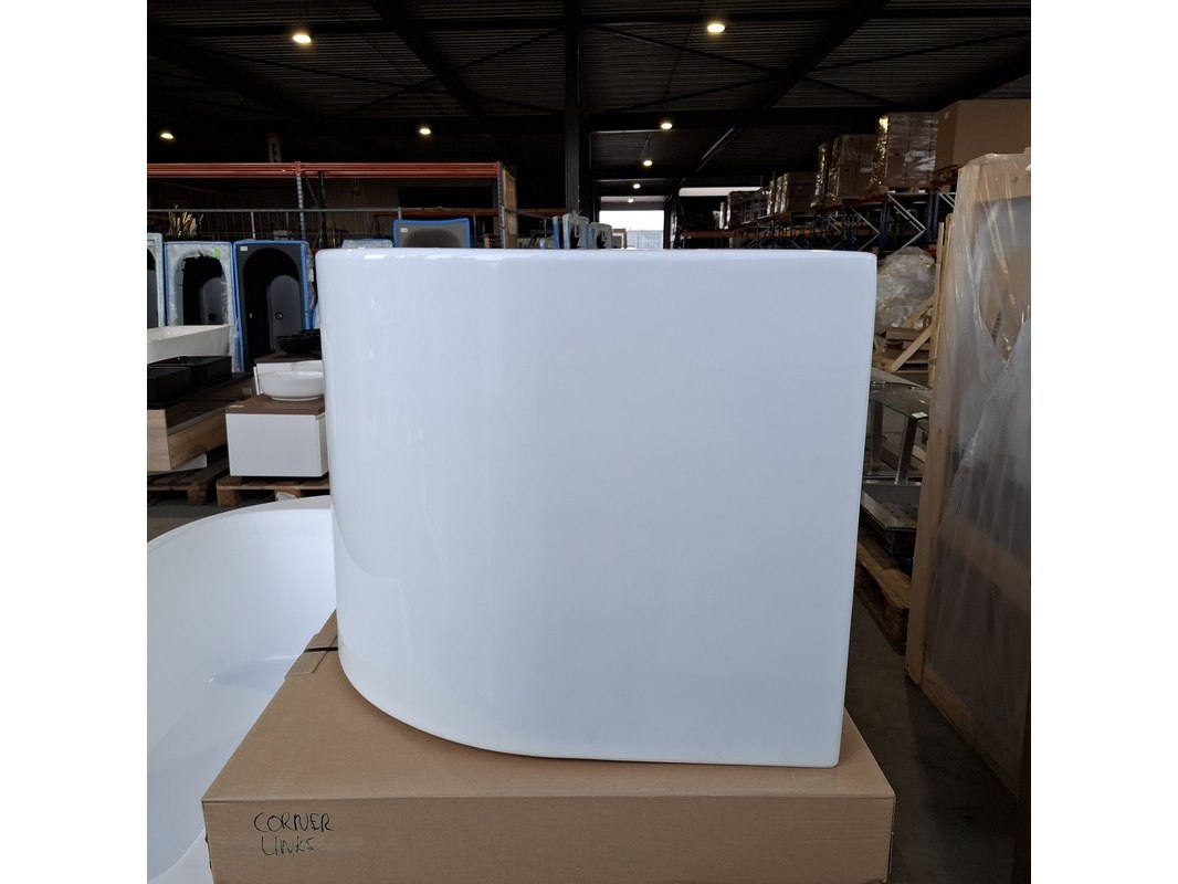 Merk: Fibrex Product: Halfvrijstaand ligbad Kleur: Glans wit Materiaal: acryl Specificaties: Corner left, incl clickwaste , incl potenset