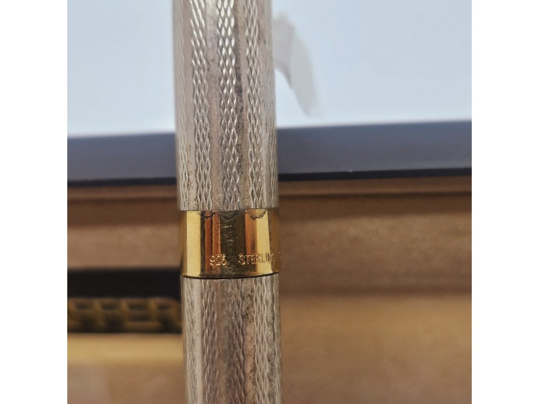 Product: Sheaffer Legacy Barleycorn - 925 zilveren balpen met goldplating - Inclusief doos Conditie: Gebruikt Specificaties: Merk: Sheaffer USA. Model: Legacy Barleycorn. Volledig .925 zilver met goldplated delen. Inclusief originele doos.