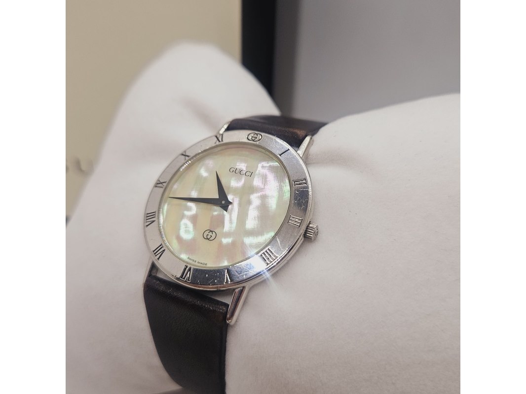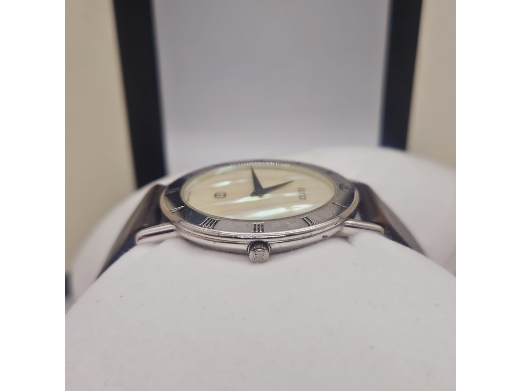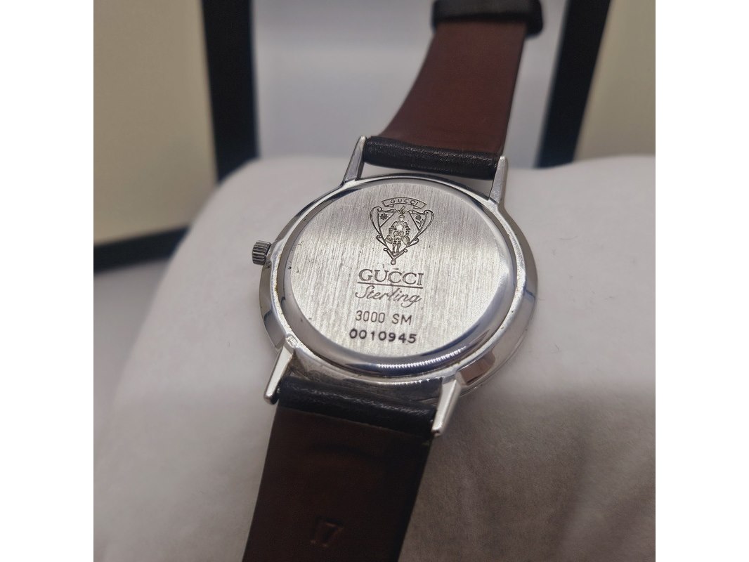 Product: Gucci 3000SM massief 925 zilveren horloge met parelmoer wijzerplaat Afmeting: 34mm Conditie: Gebruikt Specificaties: Quartz uurwerk loopt goed. Merk: Gucci. Model: 3000SM. Massief .925 sterling zilver horloge met parelmoer wijzerplaat. Inclusief originele doos en papieren. Met gebruikssporen.