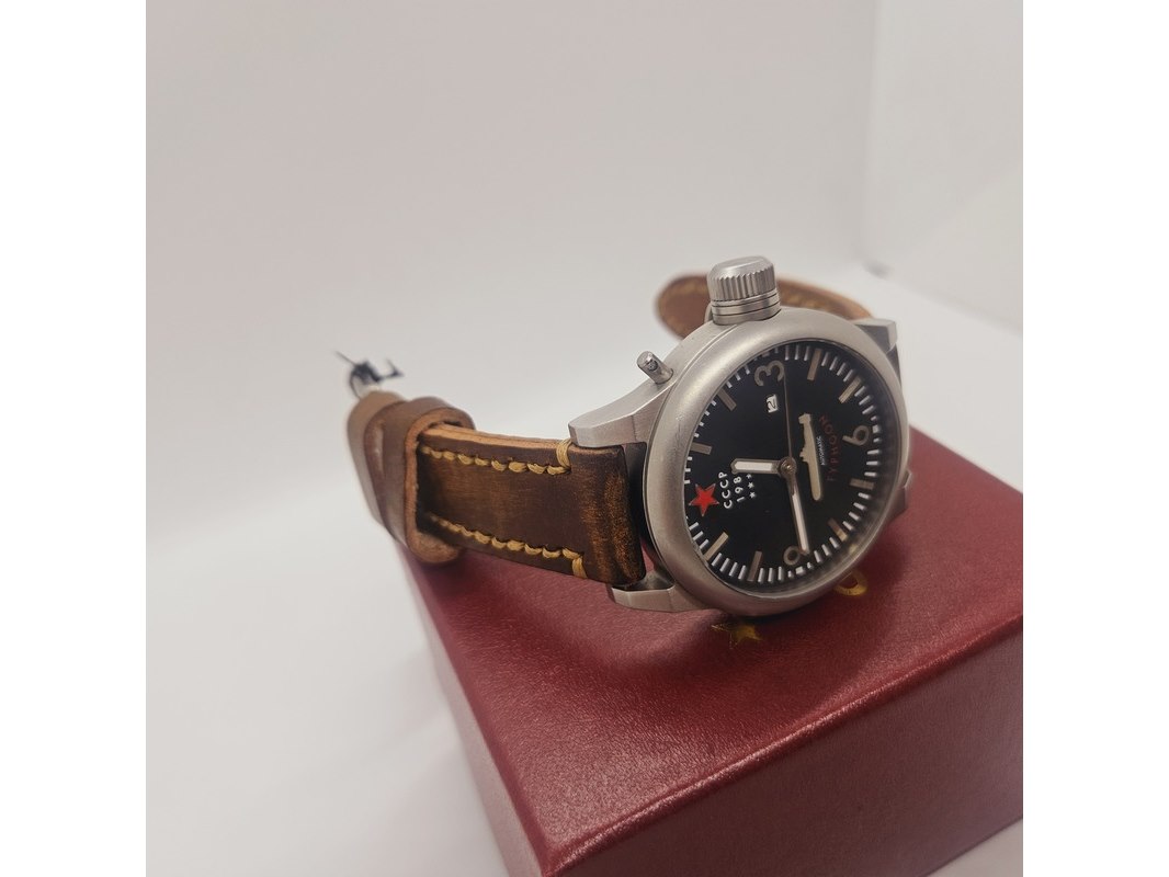 Product: Russisch CCCP Typhoon automatisch herenhorloge Afmeting: 48mm Specificaties: Automatische uurwerk loopt goed. Merk: CCCP Model: Typhoon. In new old stock conditie. Inclusief originele doos. Er is een nieuw pinnetje nodig om het kroonomhulsel vast te zetten, de werking van de kroon is verder wel goed, en alle functies werken.