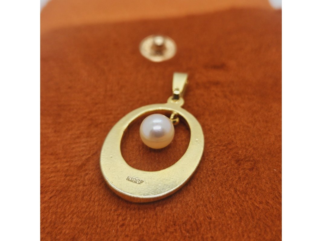 Product: 18kt goldfilled pendant hanger met parel Afmeting: 32mm x 18mm Conditie: Gebruikt Specificaties: Inclusief oranje sieraden etui. Met goudkeurmerk ''K18GF''.
