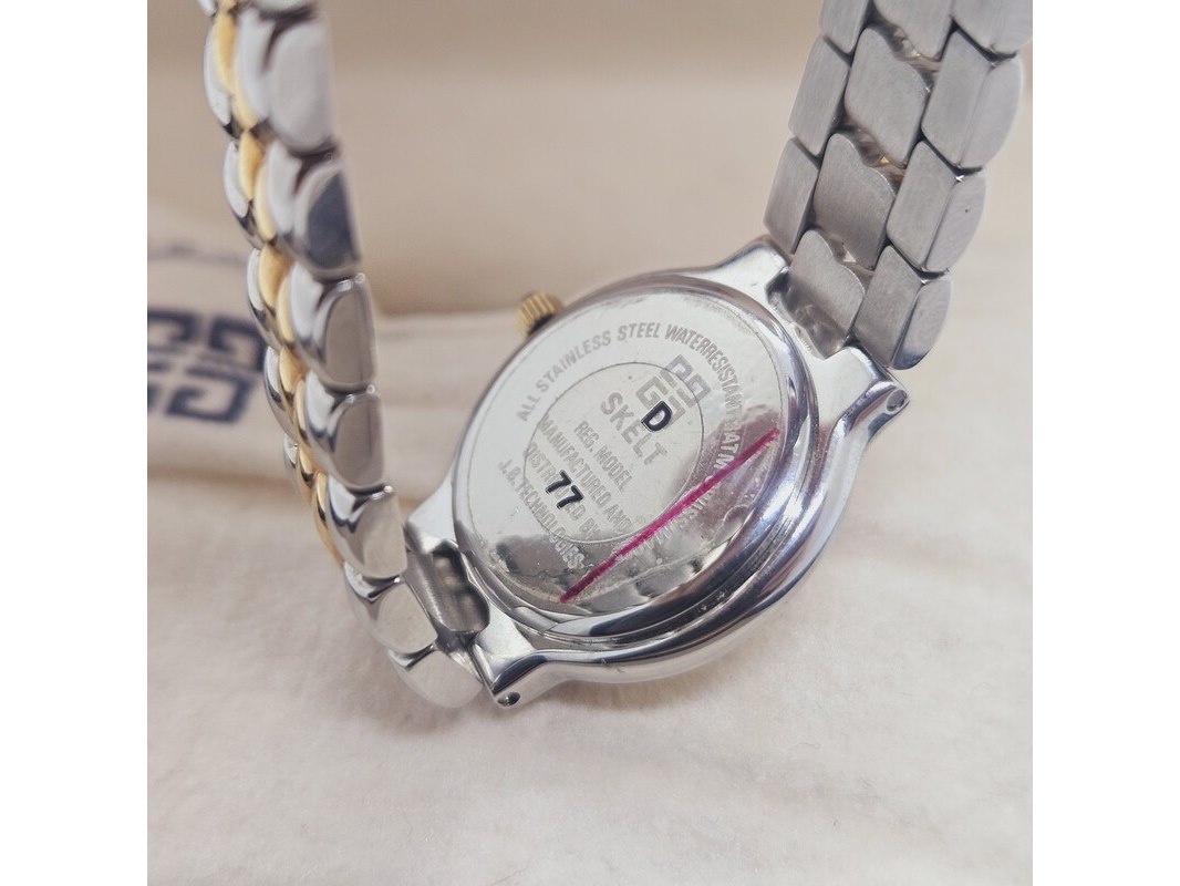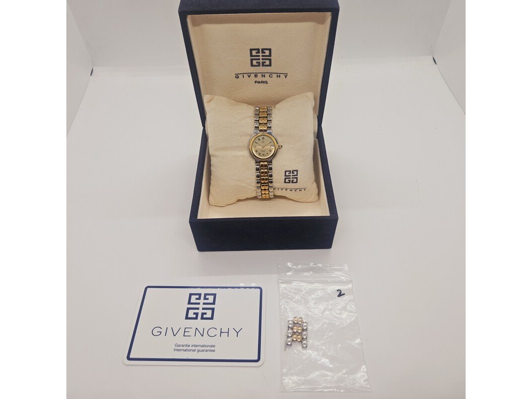 Product: Givenchy Skelt two tone dameshorloge - Inclusief doos Afmeting: 26mm Specificaties: Quartz uurwerk loopt goed. Merk: Givenchy. Model: Skelt two tone. In new old stock conditie. Inclusief originele doos en extra links.