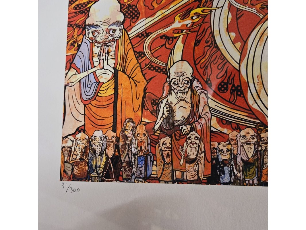 Product: Takashi Murakami Lithograaf ''The 500 Arhats'' Afmeting: 78cm x 63cm Conditie: Nieuw Specificaties: Limited edition 91/300 Uitgever Shakespeare Arts, wordt geleverd in nieuw wit frame.