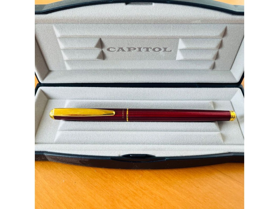 Product: Elysee Capitol 24kt GP vulpen - Made in Phorzheim Conditie: Nieuw Specificaties: 3 micron goldplated. Met Amerik rolled gold, in donkerrode lava kleurige uitvoering. Exclusief doos.