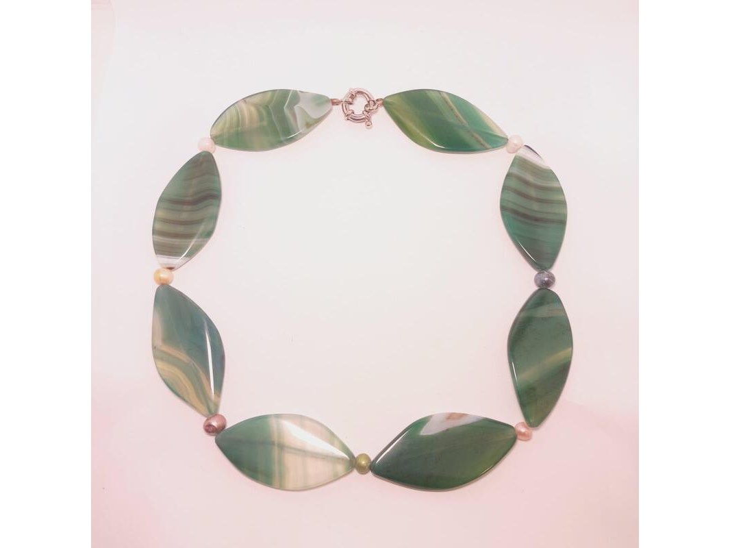 Product: Artisane zoetwater parel en agaat collier Specificaties: Leaf pattern geslepen groene agaat met zoetwater parels.