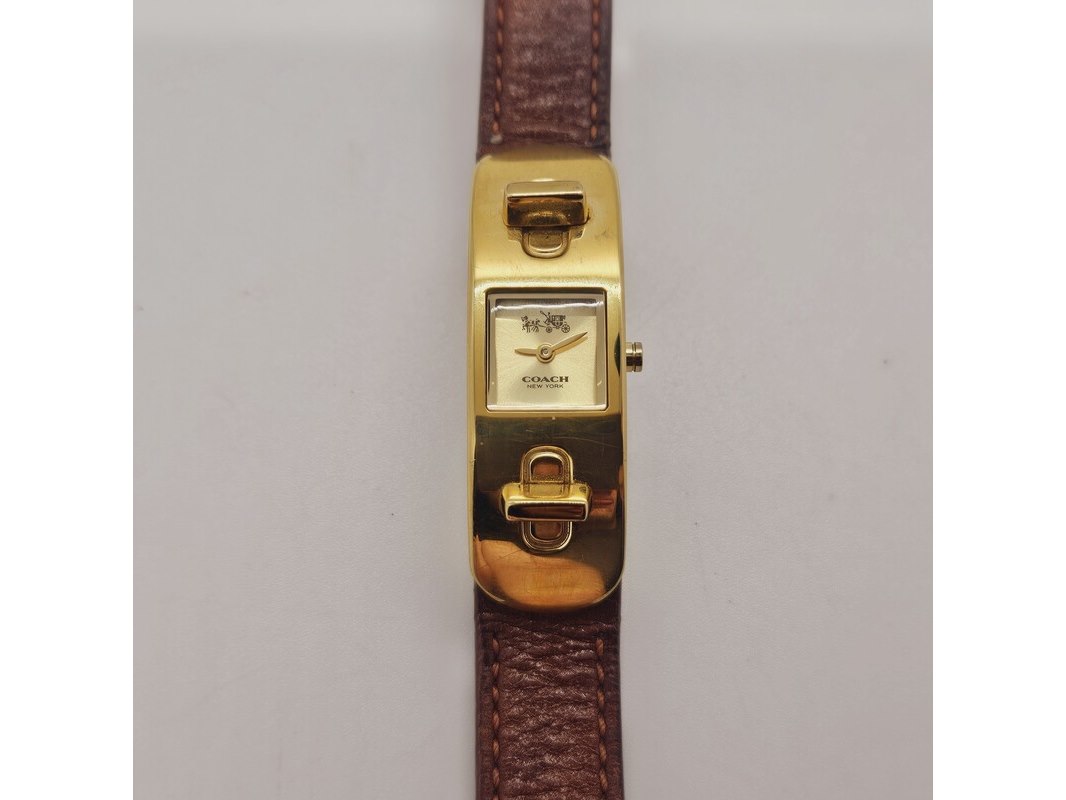 Product: Coach Swagger goldplated dameshorloge Afmeting: 18mm Conditie: Gebruikt Specificaties: Quartz uurwerk loopt goed. Merk: Coach New York. Model: Swagger. Goldplated dameshorloge. Inclusief groene etui. Heeft gebruikssporen.
