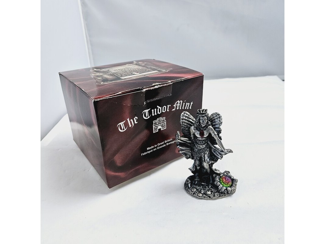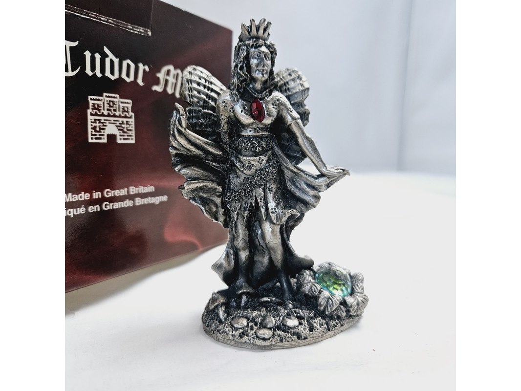 Product: Tudor Mint England - Fairy Queen statuette met zilver vergoten Conditie: Nieuw Specificaties: Gemaakt in Groot Brittannië door Tudor Mint. Een massieve pewter statuette met zilver overgoten en gedecoreerd met een kristal. Gesigneerd door kunstenaar. Nieuw in doos, doos is niet mint.