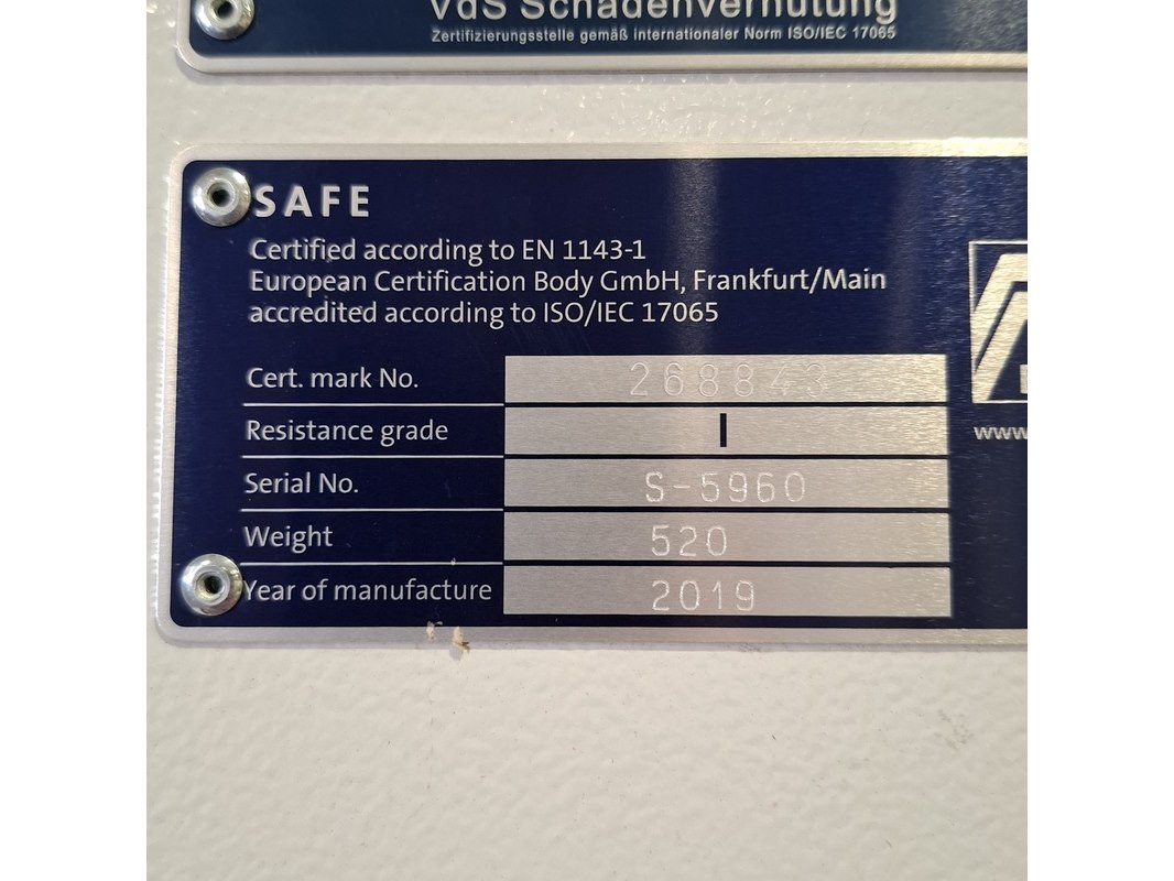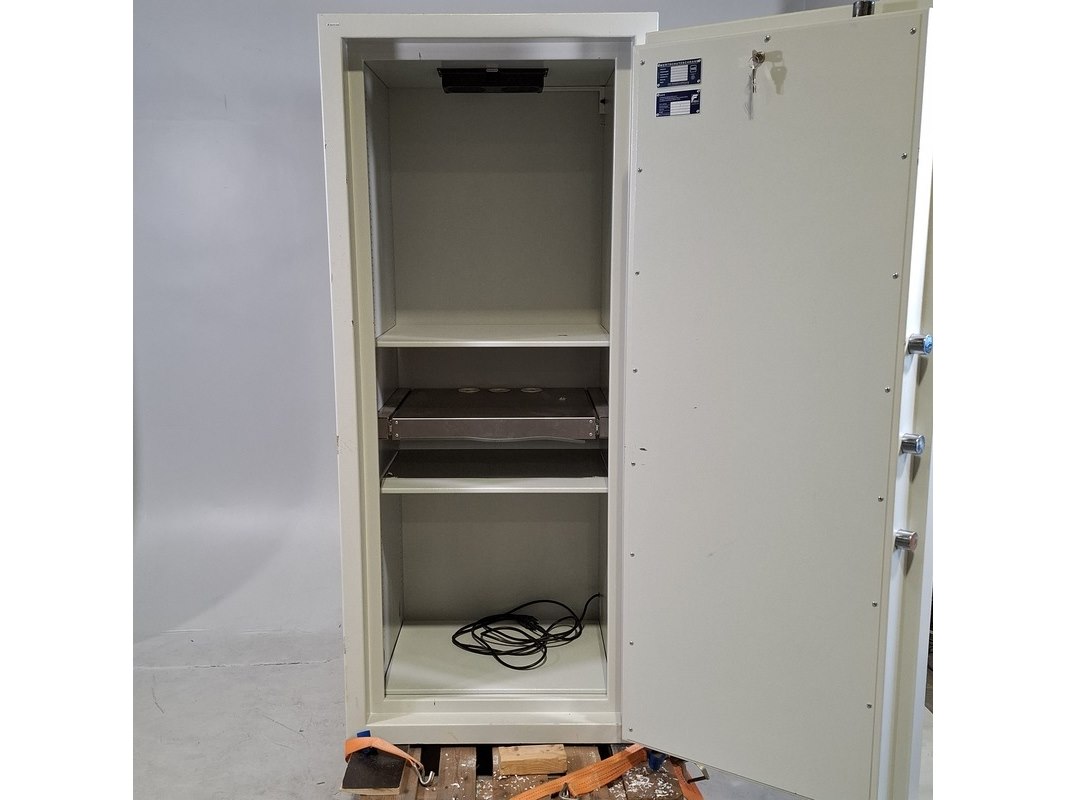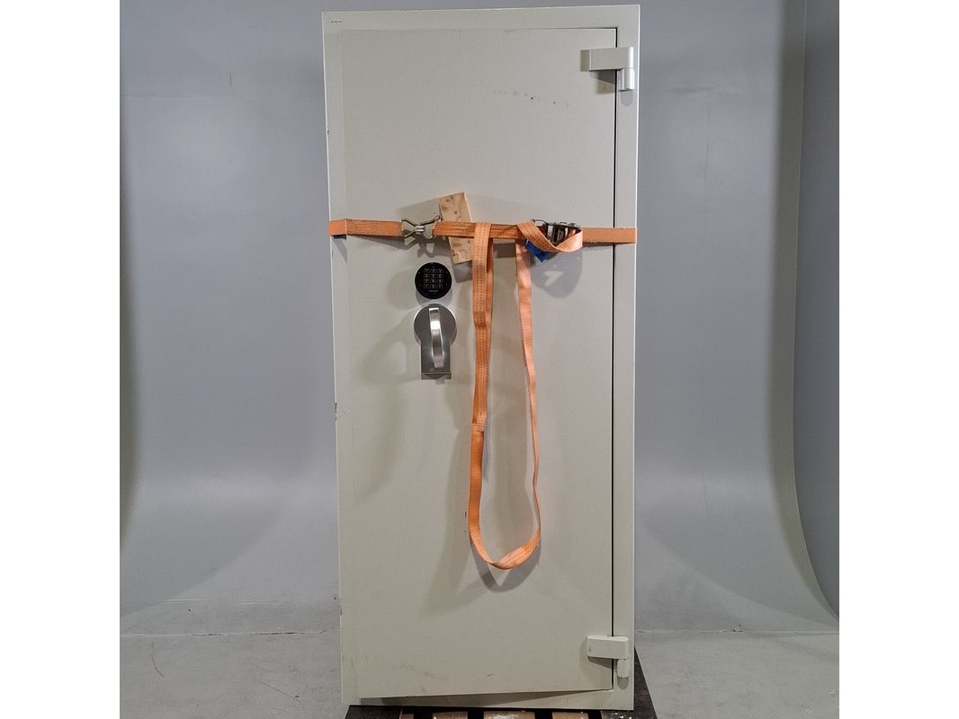 Merk: Nauta Product: Kluis Afmeting: hxbxd ca. 185x80x73 cm BouwJaar: 2019 Conditie: gebruikt Specificaties: Inclusief kluis sleutel; let op: cijfercombinatie cijferslot onbekend. Eigen gewicht 520 kg. Exclusief afgebeelde spanband.