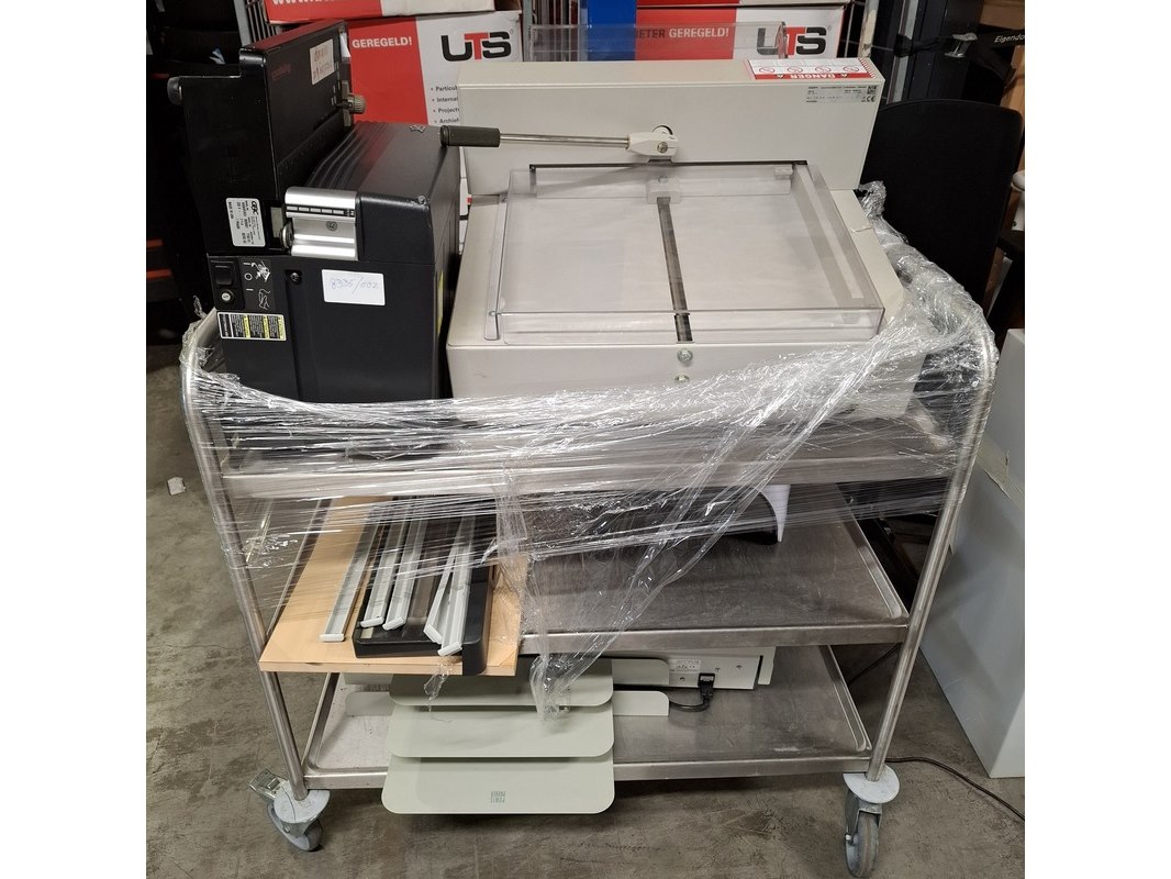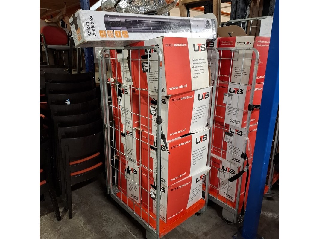 Product: Partij diverse bedrijfsinventaris Conditie: gebruikt Specificaties: Bestaande uit o.a. ventilatoren, papier snij machine, koelkast, divers stellingmateriaal, kasten, etc Technische staat en compleetheid onbekend. Exclusief rolcontainers.