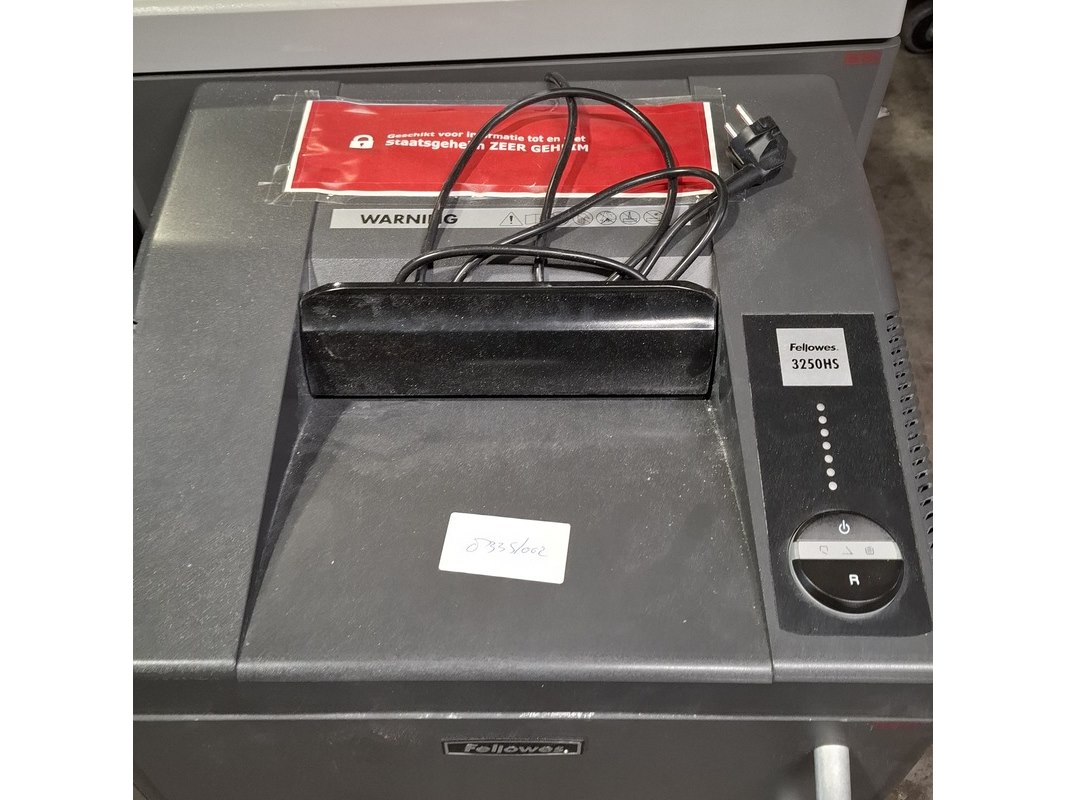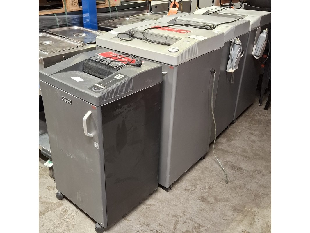 Merk: EBA/Fellowes Product: Papiervernietiger Afmeting: o.a. hxbxd ca. 100x63x58 cm Conditie: gebruikt Specificaties: 230V 50Hz Diverse soorten. Technische staat en compleetheid onbekend.