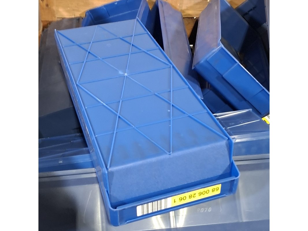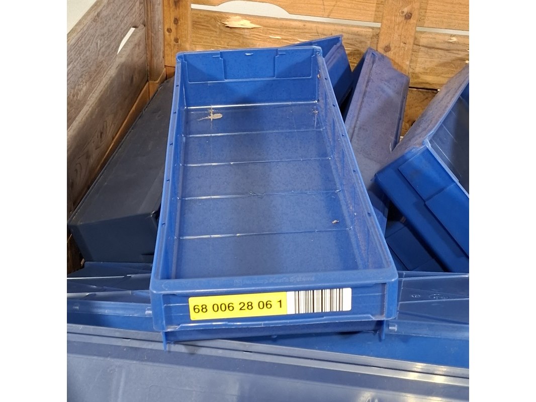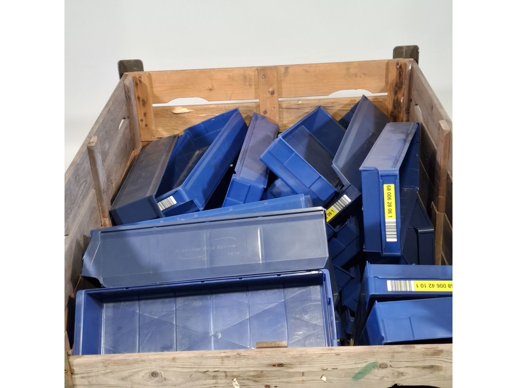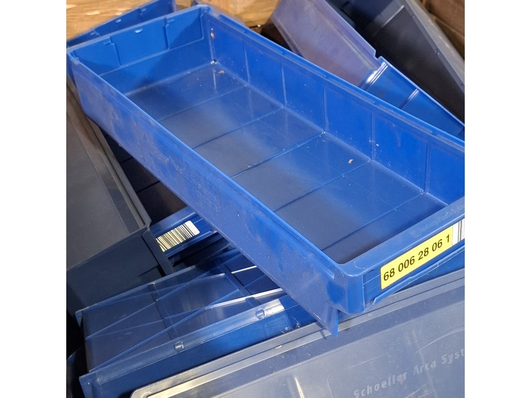 Merk: o.a. Schoeller Arca System Product: Partij magazijnbakken Afmeting: o.a. lxbxh ca. 60x23x10 cm Conditie: gebruikt Specificaties: Diverse soorten. Exclusief palletkist.