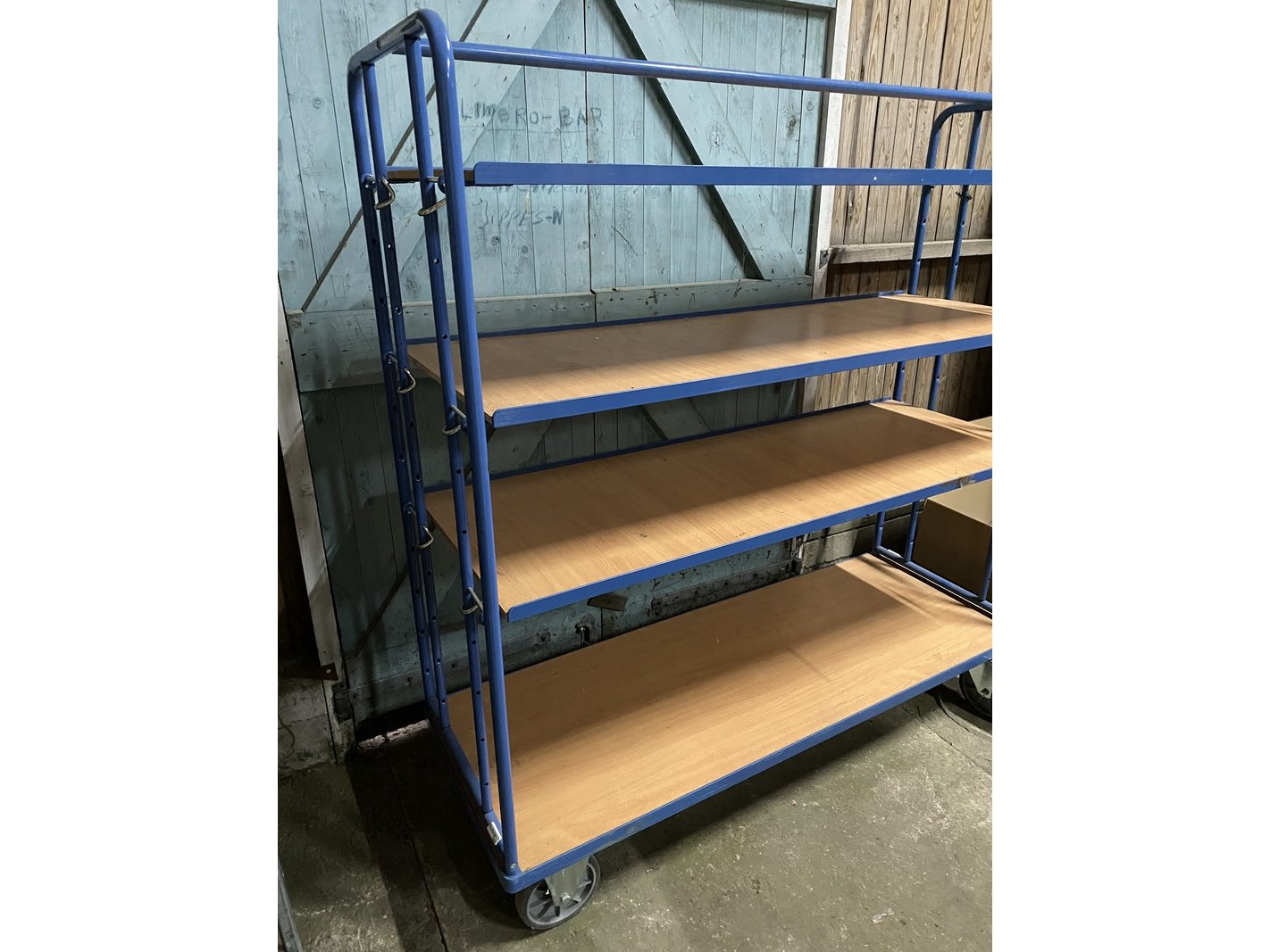 Merk: Fetra Product: Magazijn etagewagen Kleur: blauw Afmeting: 1830 x 620 x 1800mm Conditie: Gebruikt Specificaties: Stalen buis-/profielstalenconstructie, gepoedercoat RAL 5007. 1 Vaste en 3 losse etages van houten plaat, toplaag beukendecor,in stalen frame gelegd met 15 mm hoge rand aan de lange zijden. losse etages variabel einlegbar, inhangbaar in een raster van 120 mm. Mogelijke neiging bij schuine inhanging ca. 15 en ca. 30 graden. Draagvermogen per etage 80 kg. 2 Zwenk- en 2 bokwielen, TPE rubber, naaf met kogellager. Zwenkwielen met rem, conform EU-norm EN 1757-3 (veiligheidsnorm voor platformwagens). Adviesprijs: €829