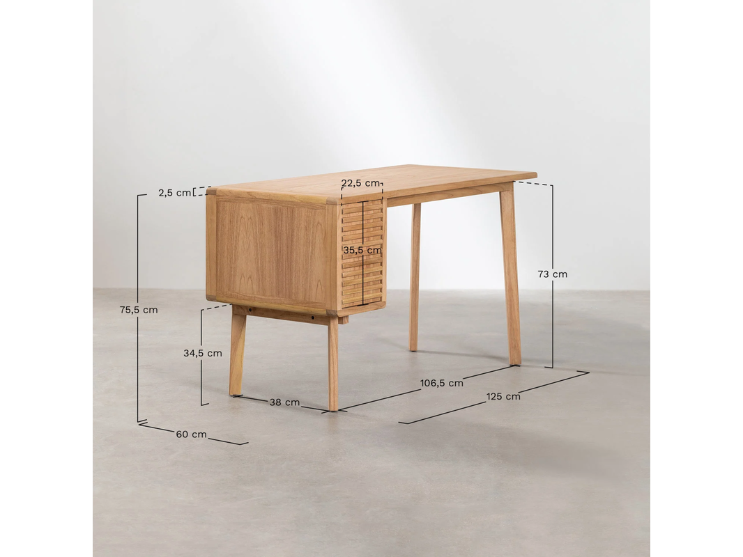 Merk: Sklum Product: Bureau Afmeting: 125x60x75,5cm Conditie: nieuw Specificaties: Bureau 125x60 cm in mindihout Deleyna. De vervaardiging uit mindi hout geeft het een robuuste uitstraling. Het heeft ruimte om je documenten en kantoorbenodigdheden op te bergen, wat je helpt om je werkruimte te allen tijde netjes te houden. Wat het ontwerp in vintage stijl bijzonder maakt, is het originele reliëfdetail op de lade. Adviesprijs: €250