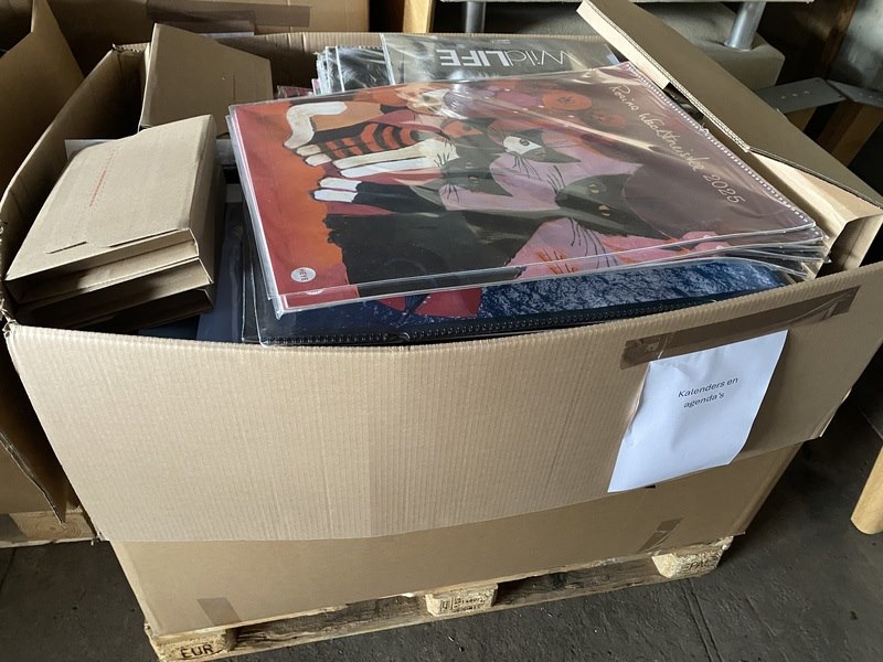 Product: tuinmanden, boeken en agenda's Conditie: nieuw Specificaties: Partij van 32 sets plantenmanden van Mica Decorations en twee palletdozen met agenda's boeken en kalenders (1436 stuks). De plantenmanden voor buiten zijn vervaardigd van plastic. De set bestaat uit drie manden met afmetingen van H30 x Ø27 cm, H32 x Ø30 cm en H35 x Ø34 cm. Deze formaten zijn geschikt voor planten of een klein boompje. De binnenkant van de manden is voorzien van een plastic liner, waardoor je er gemakkelijk een plant in kunt potten. Zie het bijgevoegde bestand voor het volledige en gespecificeerde overzicht van de producten. Totaal adviesprijzen: €21.858