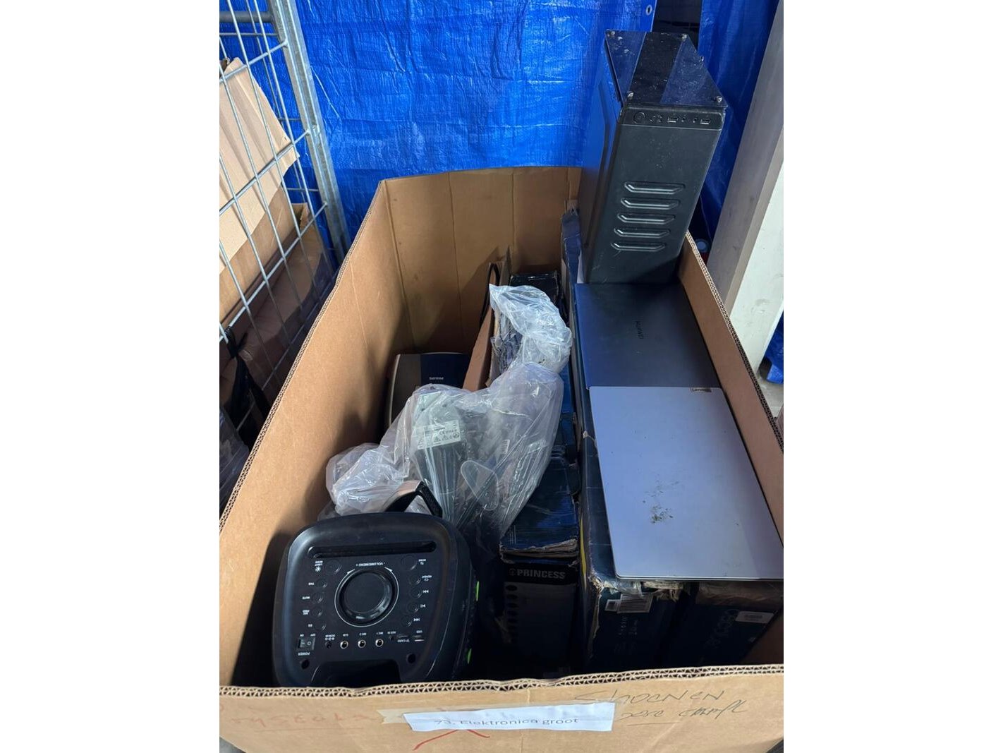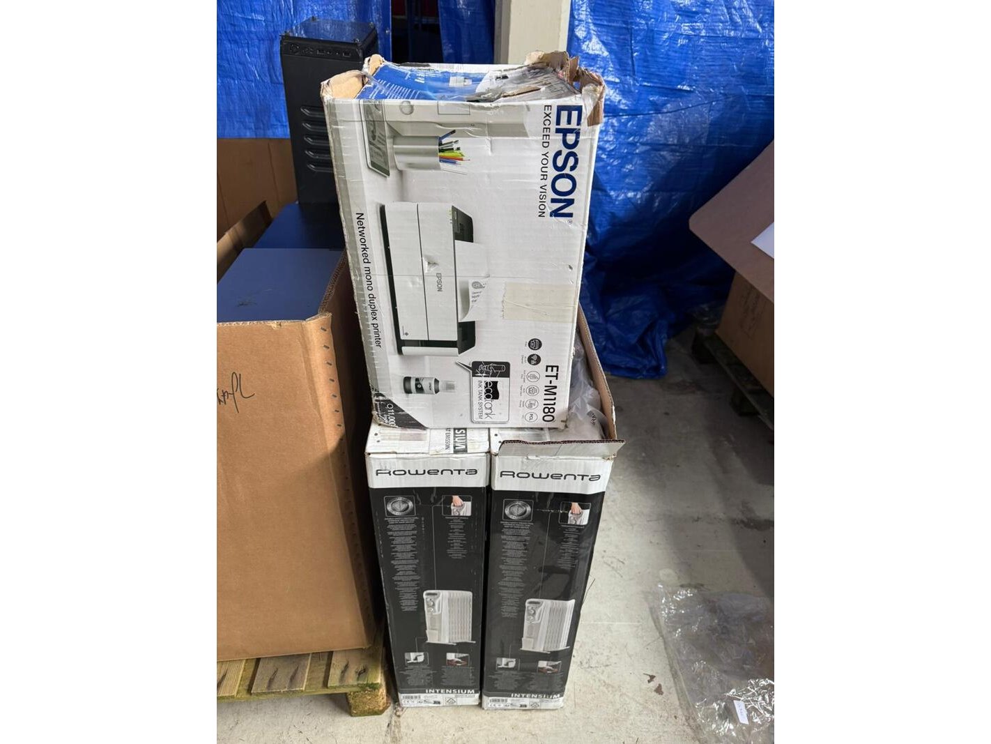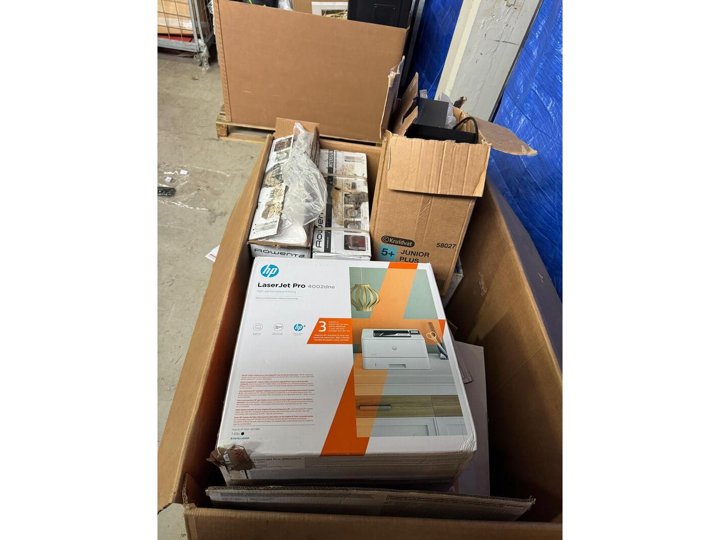 Product: elektronica Afmeting: 2 dozen vol Conditie: Nieuw en retourgoed Specificaties: Partij bestaande uit twee palletdozen met elektronische producten. Deze partij omvat twee dozen met diverse elektronische producten. In de partij zijn onder andere de volgende artikelen opgenomen: – Epson EcoTank ET-M1180 A4 inkjetprinter (adviesprijs circa €450) – 2× Rowenta Intensium BU2620F0 verwarming (adviesprijs circa €120 per stuk) – HP LaserJet Pro 4002dne printer (adviesprijs circa €450) – HP Color LaserJet Pro MFP M479fnw printer (adviesprijs circa €765) – Cecotec ReadyWarm 2000 elektrische kachel / convector (wit) (adviesprijs circa €86) De genoemde producten geven een indicatie van de inhoud van de partij. Voor een volledig en actueel overzicht van de inhoud en de staat van de producten wordt verwezen naar de bijgevoegde foto’s.