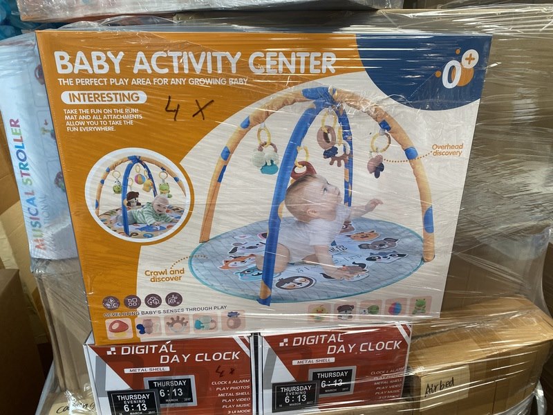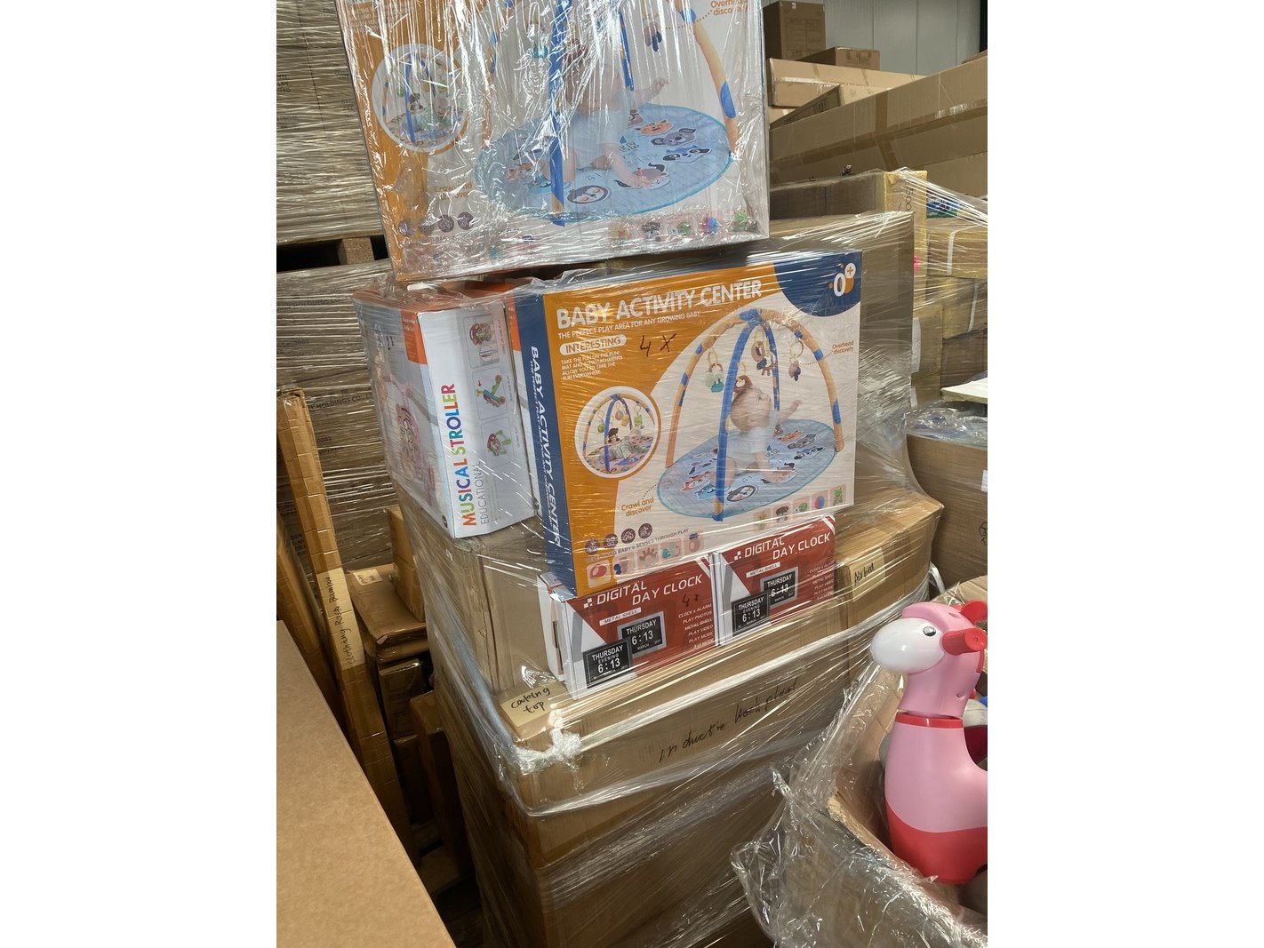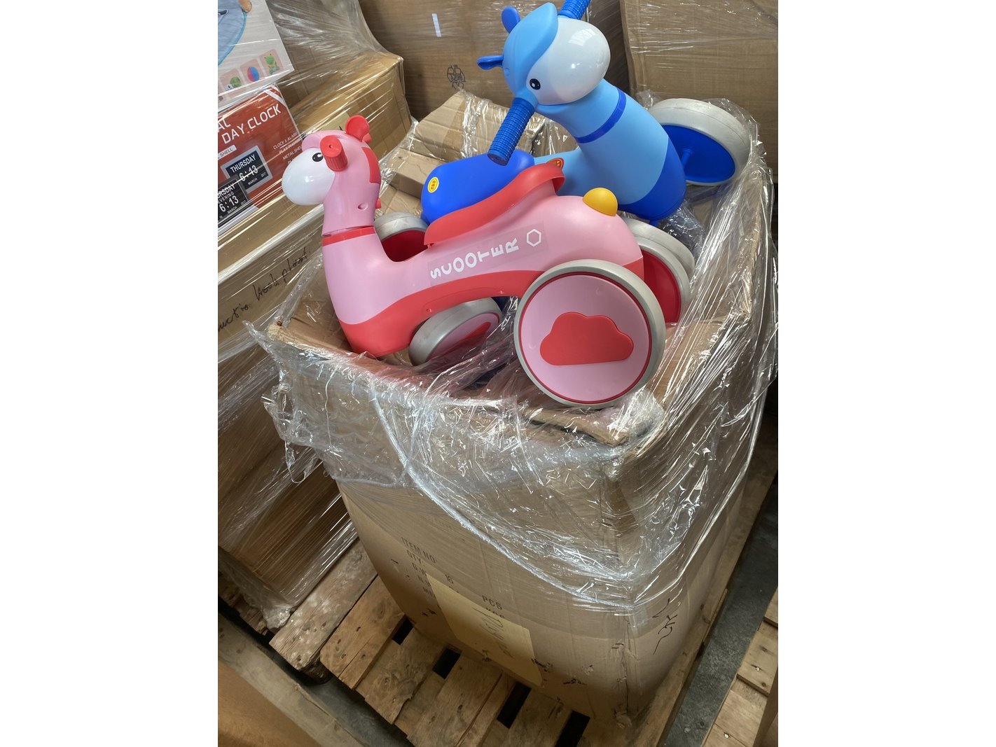 Product: pallet webshopartikelen en -speelgoed Conditie: Demomodel Specificaties: Partij webshopartikelen en speelgoed. De partij bestaat onder andere uit Babyspeelmatten, fietsjes, kledingrekken, klokken en divers speelgoed. De producten hebben als demomodel tentoon gestaan.
