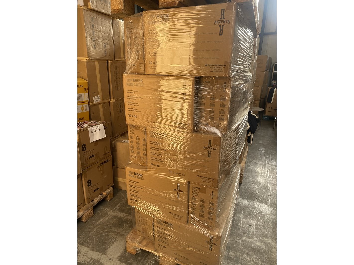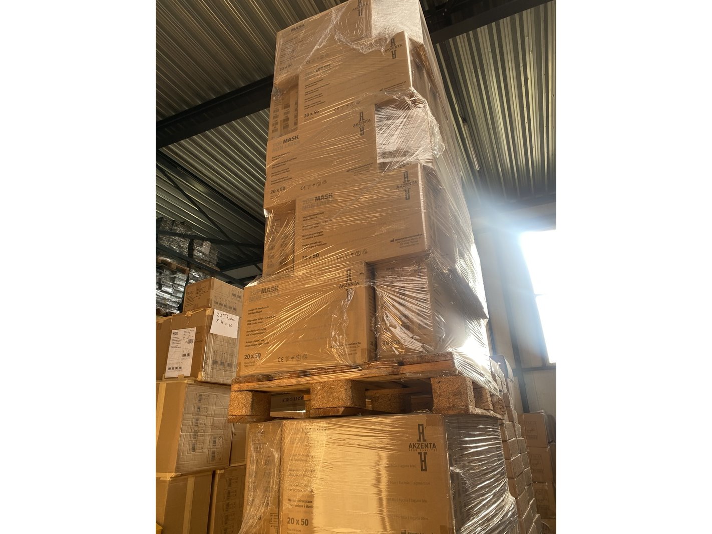 Merk: Akzenta Product: Mondkapje Kleur: wit Conditie: Nieuw Specificaties: Partij van circa 80.000 mondkapjes op twee pallets.