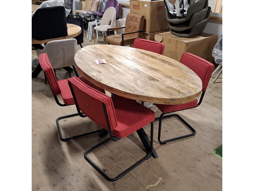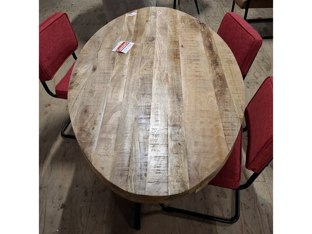Product: Ovale eetkamertafel met 4x stoel Specificaties: Tafel ovaal, mangohout, spinpoot, lxbxh ca. 180x100x77 cm. 4x Eetkamerstoel, zithoogte ca. 51 cm. Betreft showroommodellen, kan een beschadiging bevatten.