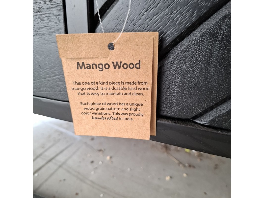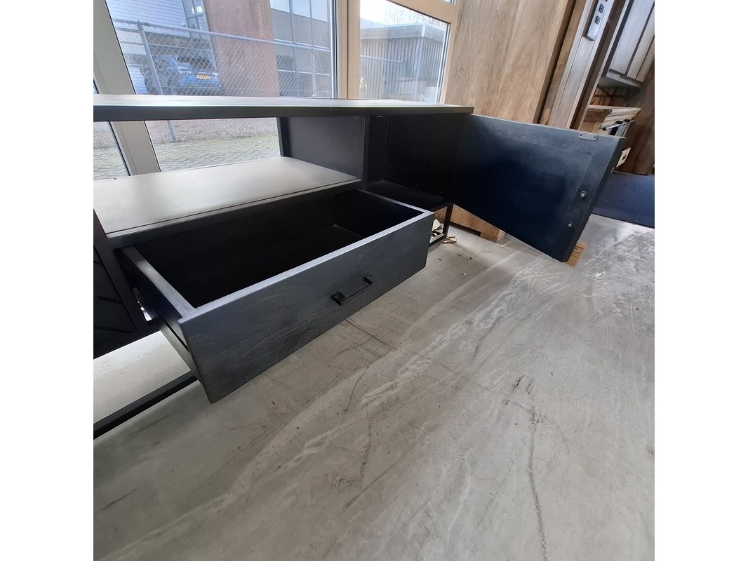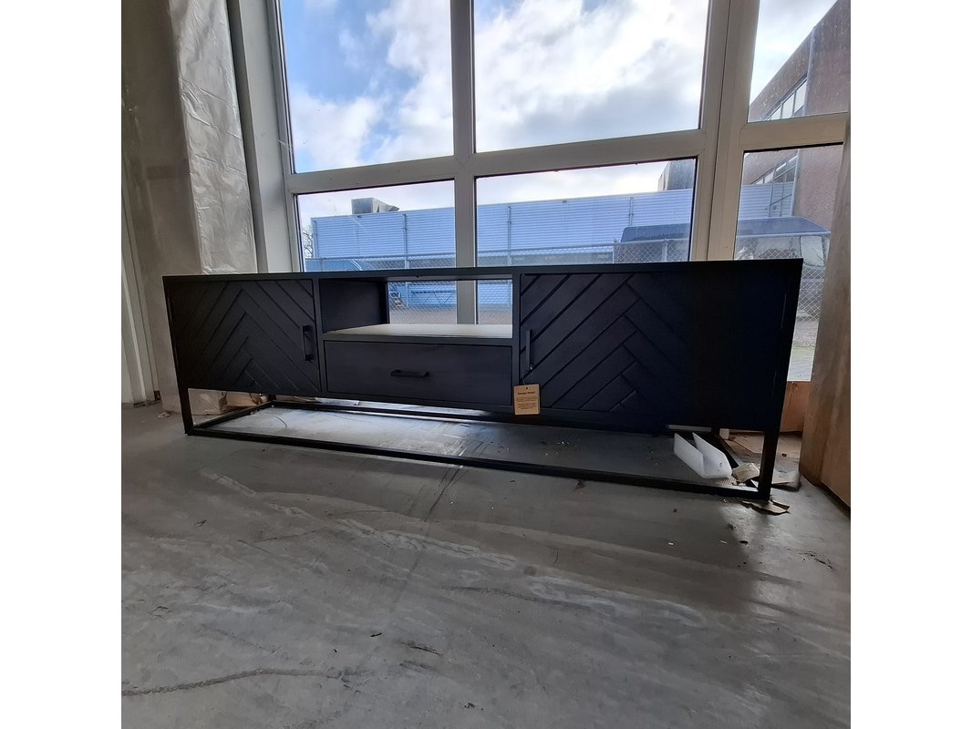 Product: TV meubel, mangohout Kleur: Zwart Materiaal: mangohout/metaal Afmeting: hxbxd ca. 56x180x40.5 cm Specificaties: Betreft een showroommodel, kan een beschadiging bevatten.