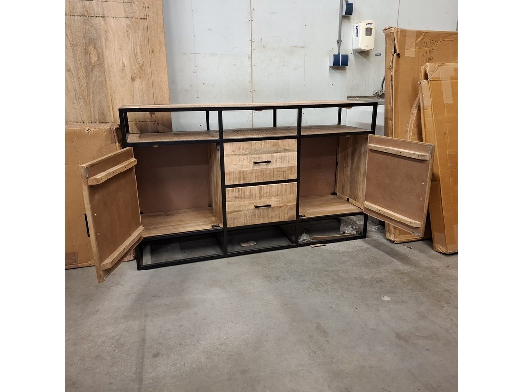 Product: Dressoir, mangohout Materiaal: Mangohout/metaal Afmeting: 91x150x45.5 cm Specificaties: Betreft een showroommodel, kan een beschadiging bevatten.