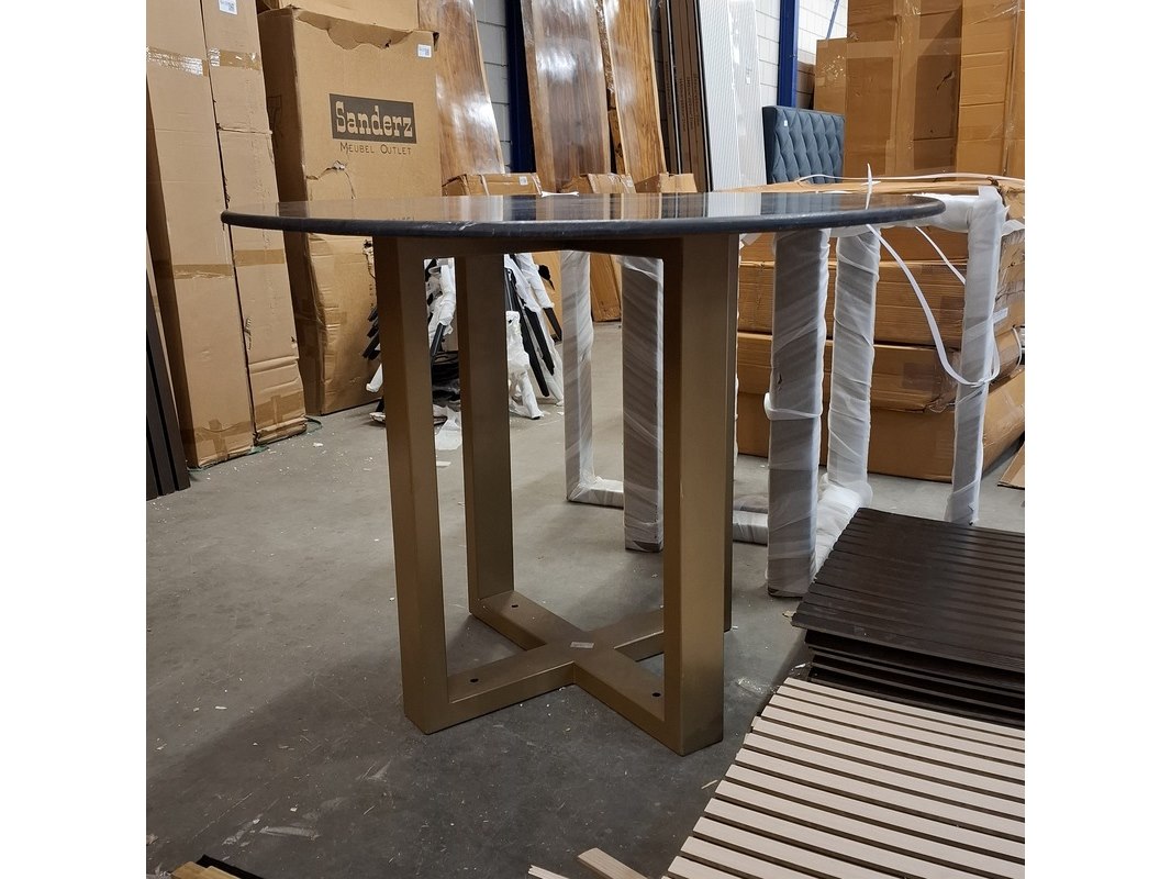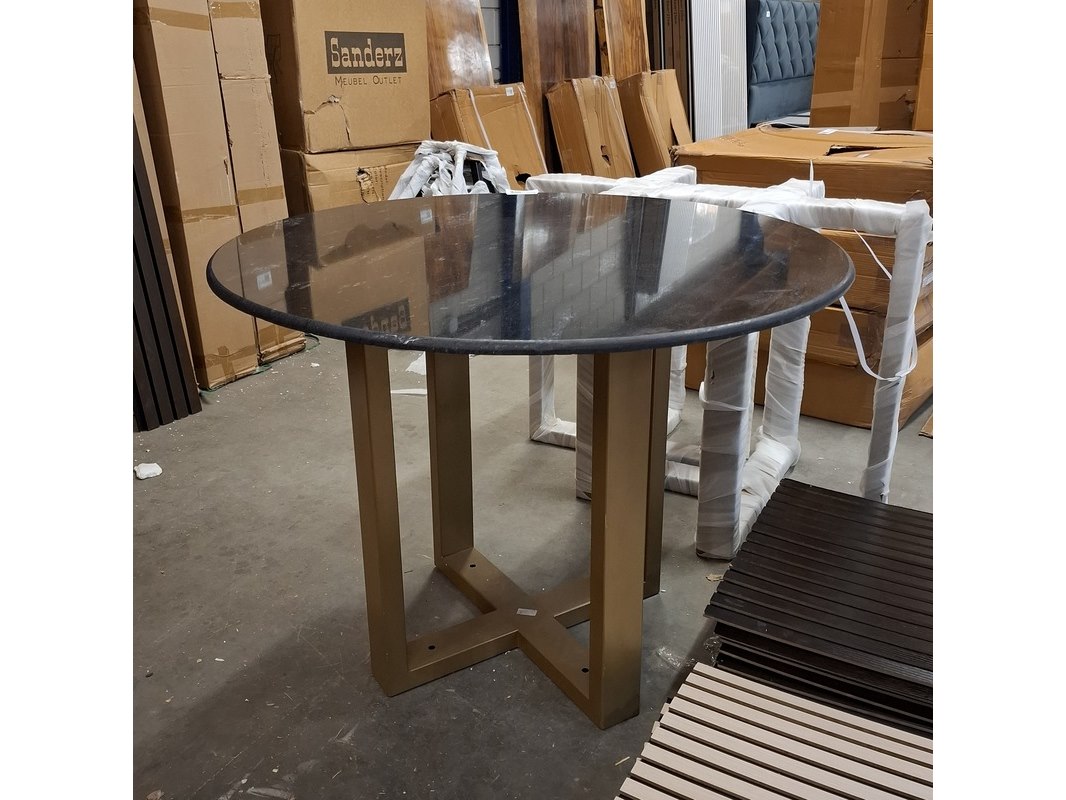 Product: Ronde eetkamertafel met marmerenblad Kleur: Zwart Afmeting: Diameter ca. 100 cm, hoogte ca. 77 cm Specificaties: Met goudkleurige kruispoot.