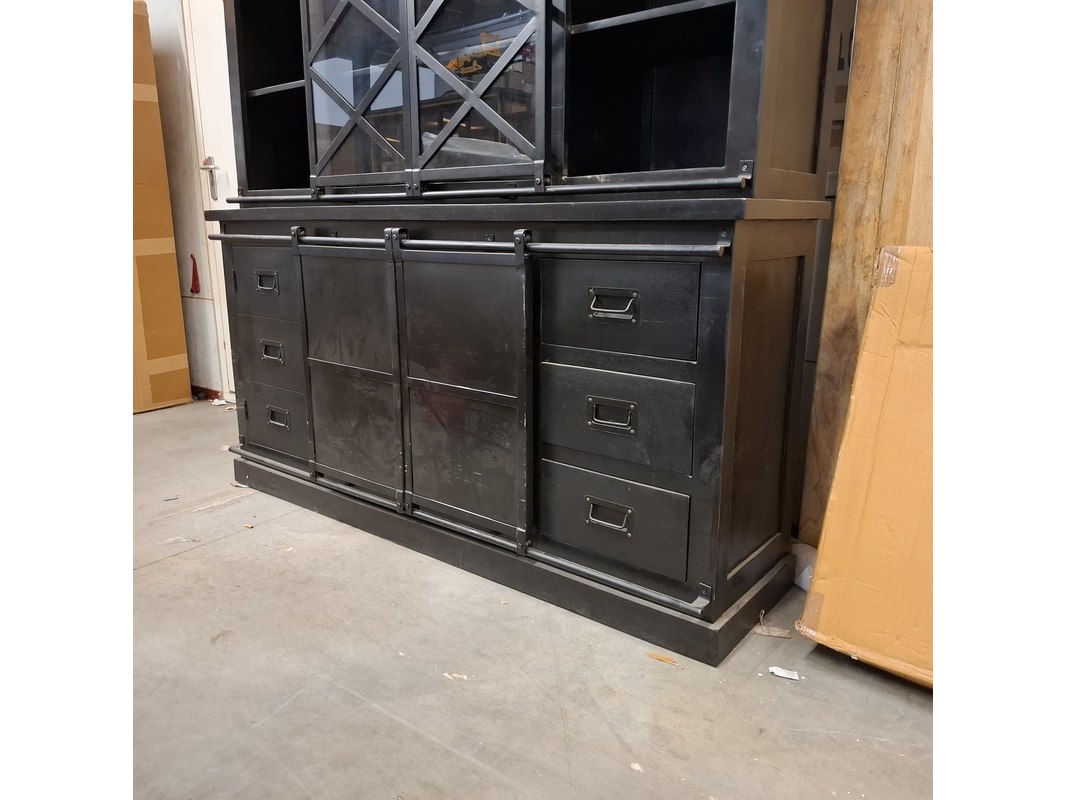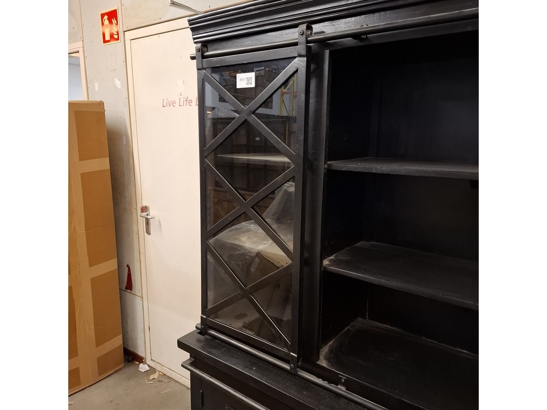 Product: Buffetkast, mangohout Kleur: Zwart Materiaal: Mangohout/metaal Afmeting: Ca. 180x45x200 cm Specificaties: In 2x doos