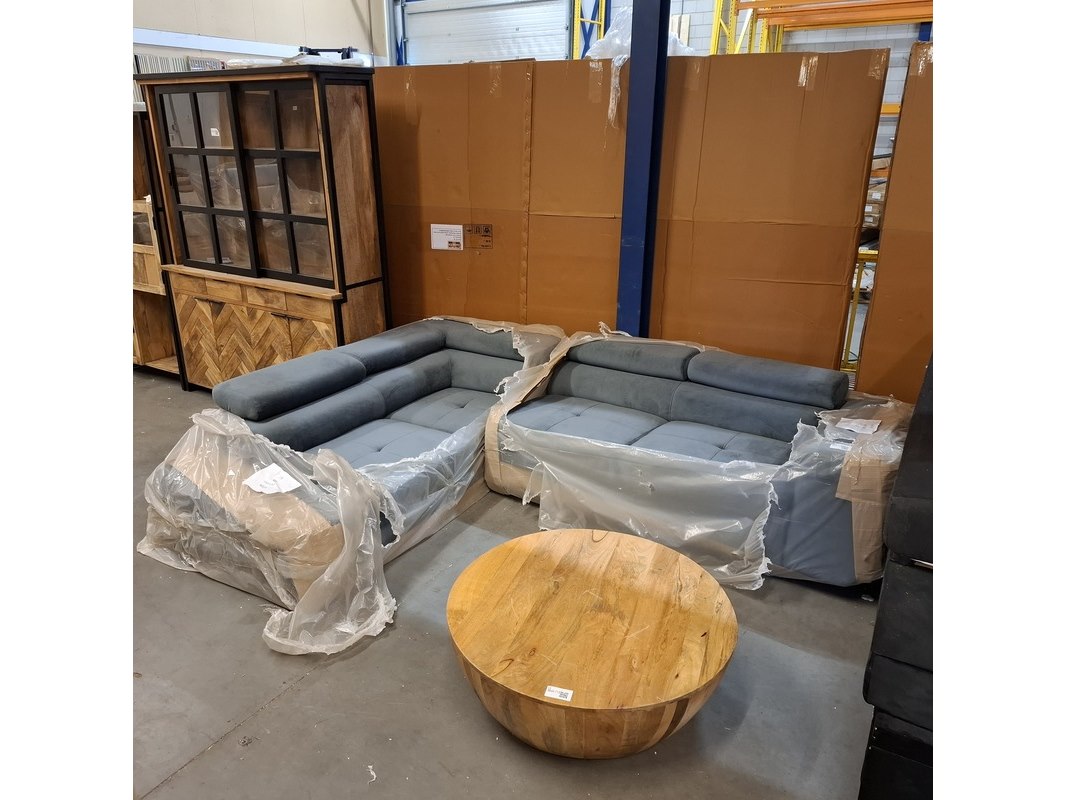Product: Hoekbank met verstelbare hoofdsteunen Kleur: Blauw/grijs Afmeting: lxbxh ca. 213x205x63/78 cm Specificaties: Bank bestaat uit 2 delen