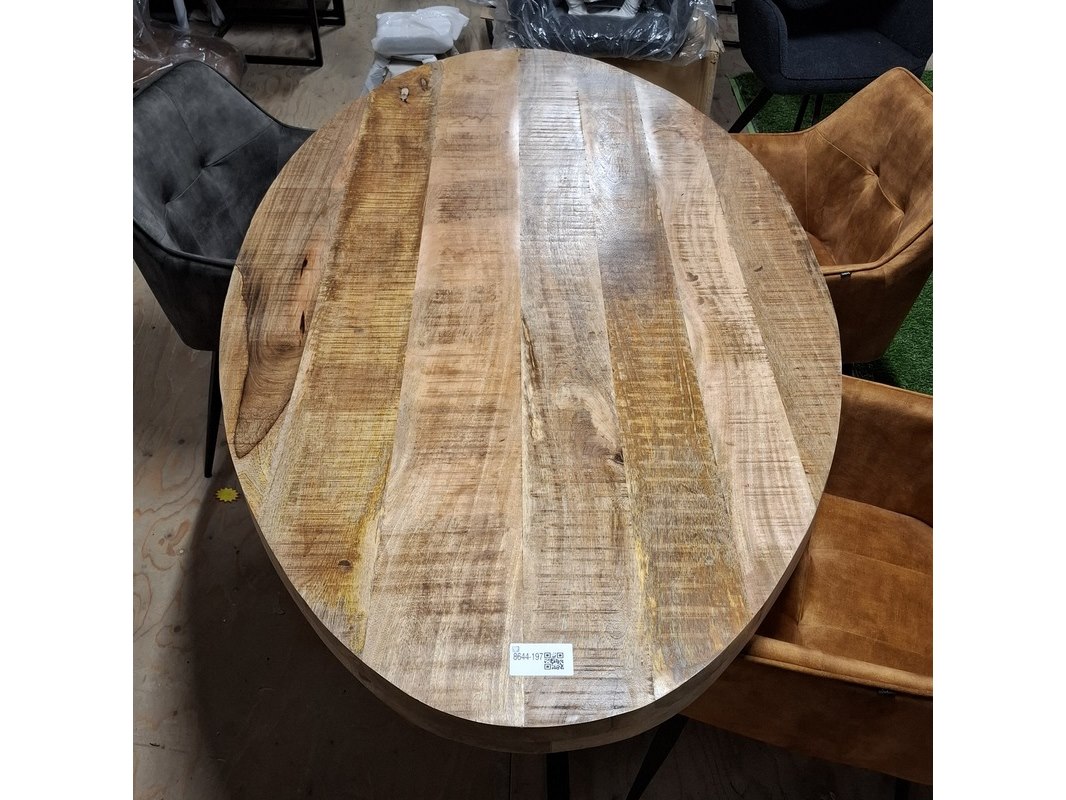 Product: Ovale eetkamertafel met 4x stoel Specificaties: Tafel, ovaal, mangohout, spinpoot, hxbxd ca. 180x100x77 cm. 4x eetkamerstoel (2x groen en 2x okergeel), zithoogte ca. 49 cm. Betreft showroommodellen, kan een beschadiging bevatten.
