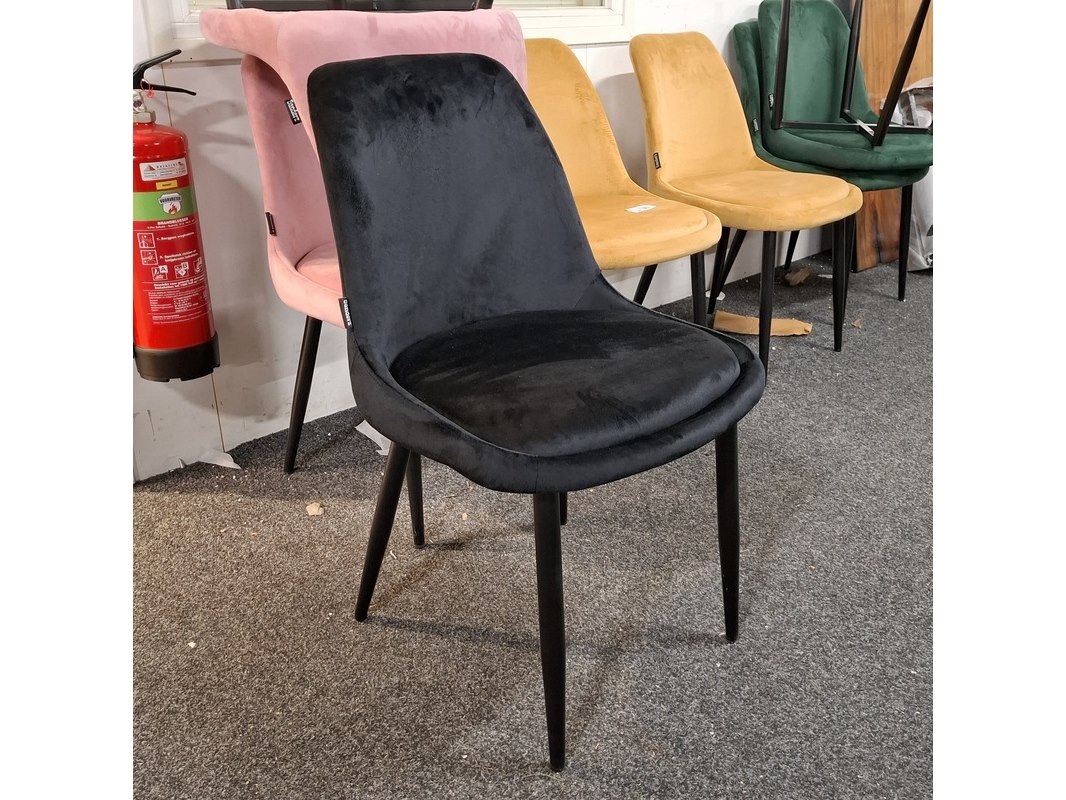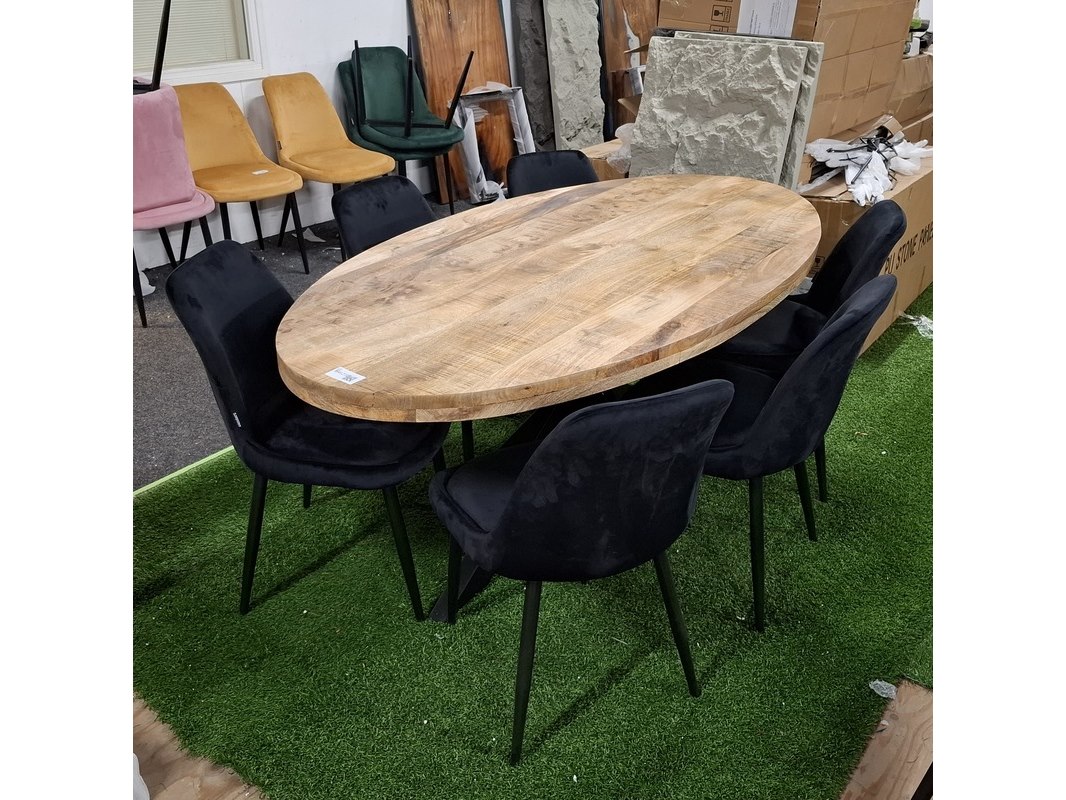 Product: Ovale eetkamertafel met 6x stoel Specificaties: Tafel, ovaal, mangohout, spinpoot, hxbxd ca. 200x100x78 cm, 6x eetkamerstoel, velvet, zwart, zithoogte ca. 48 cm. Betreft showroommodellen, kan een beschadiging bevatten.