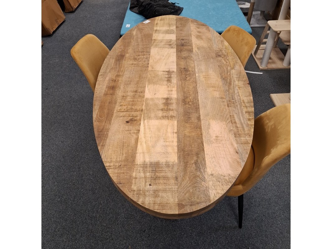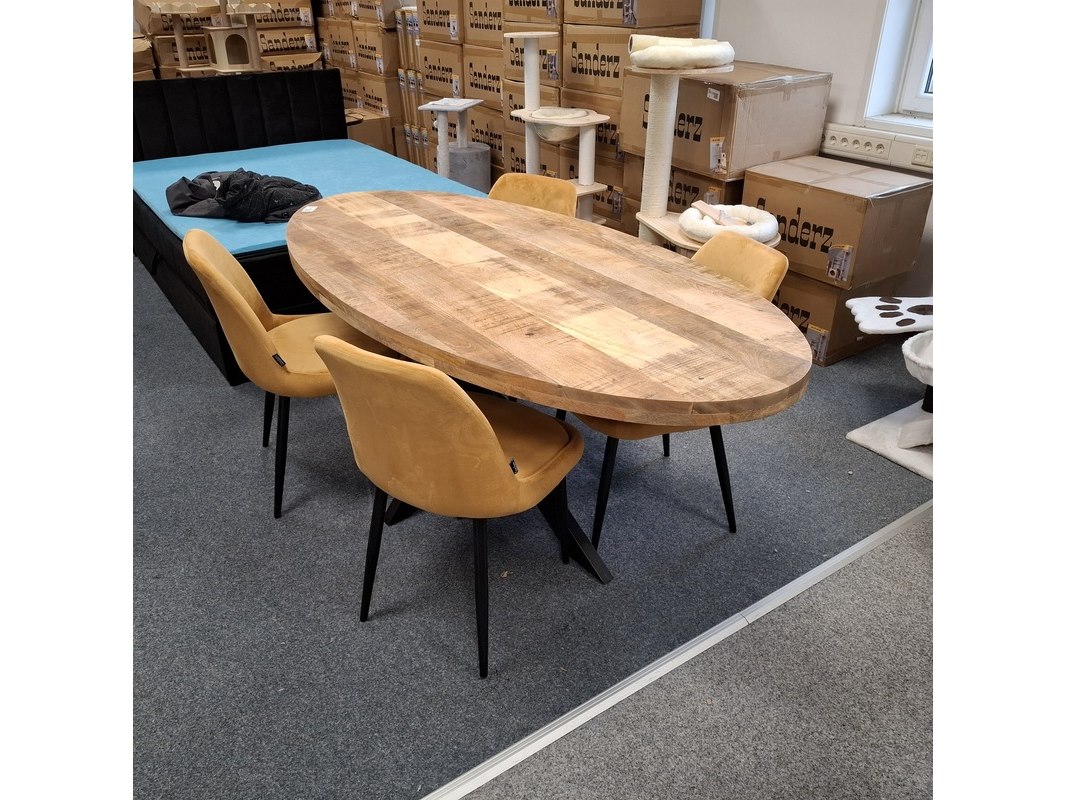 Product: Ovale eetkamertafel met 4x stoel Specificaties: Tafel, ovaal, kruispoot, mangohout, lxbxh ca. 200x100x76 cm. 4x Eetkamerstoel, geel, velvet, zithoogte ca. 48 cm. Betreft showroommodellen, kan een beschadiging bevatten.