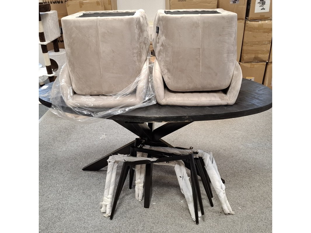 Product: Ovale eetkamertafel met 4x stoel Specificaties: Tafel, zwart, spinpoot, lxbxh ca. 180x100x78 cm. 4x Eetkamerstoel, zithoogte ca. 48 cm. Betreft showroommodellen, kan een beschadiging bevatten.