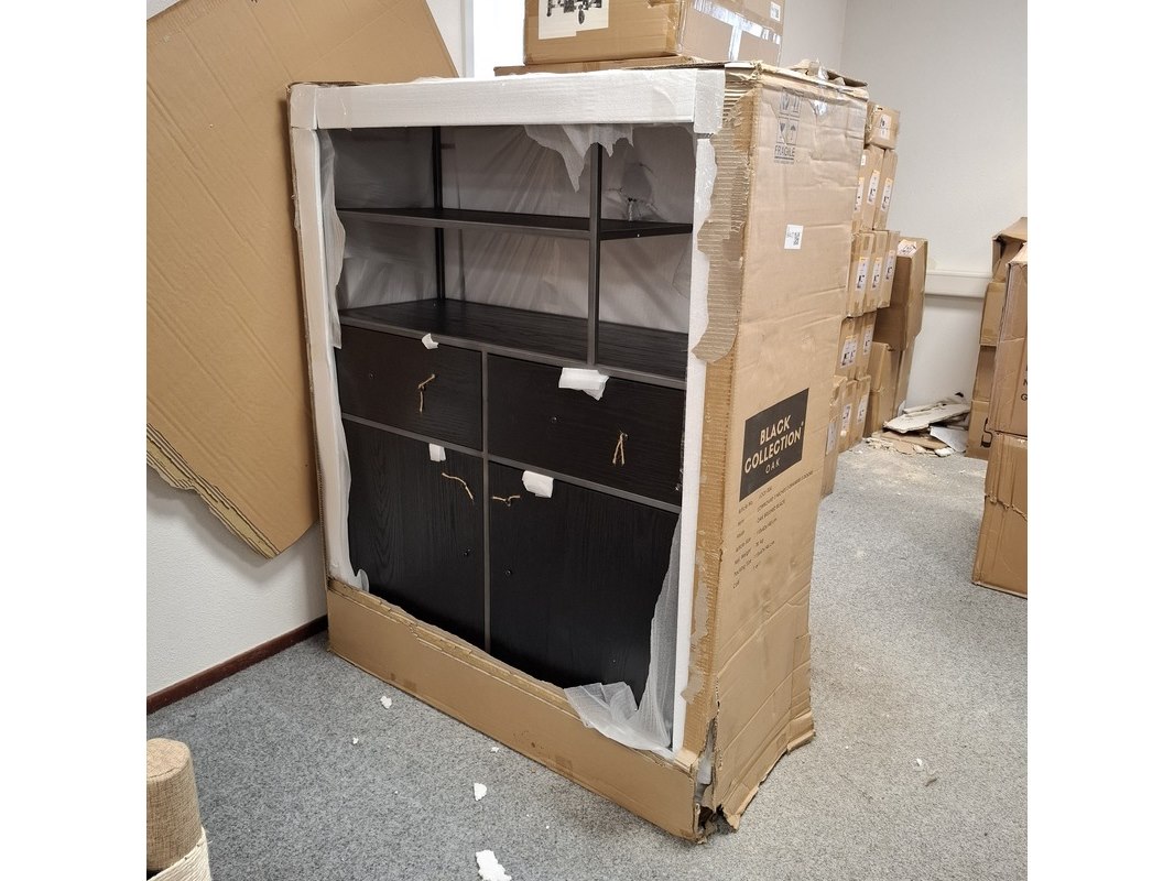 Product: Wandkast Kleur: Zwart Afmeting: 110x42x140 cm Specificaties: 2x deur, 2x lade en 3 open vak. In doos.