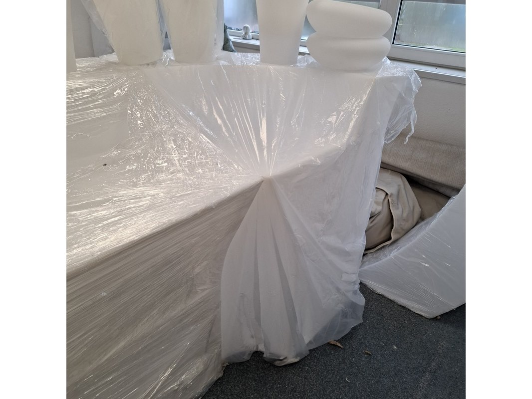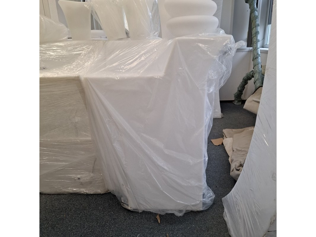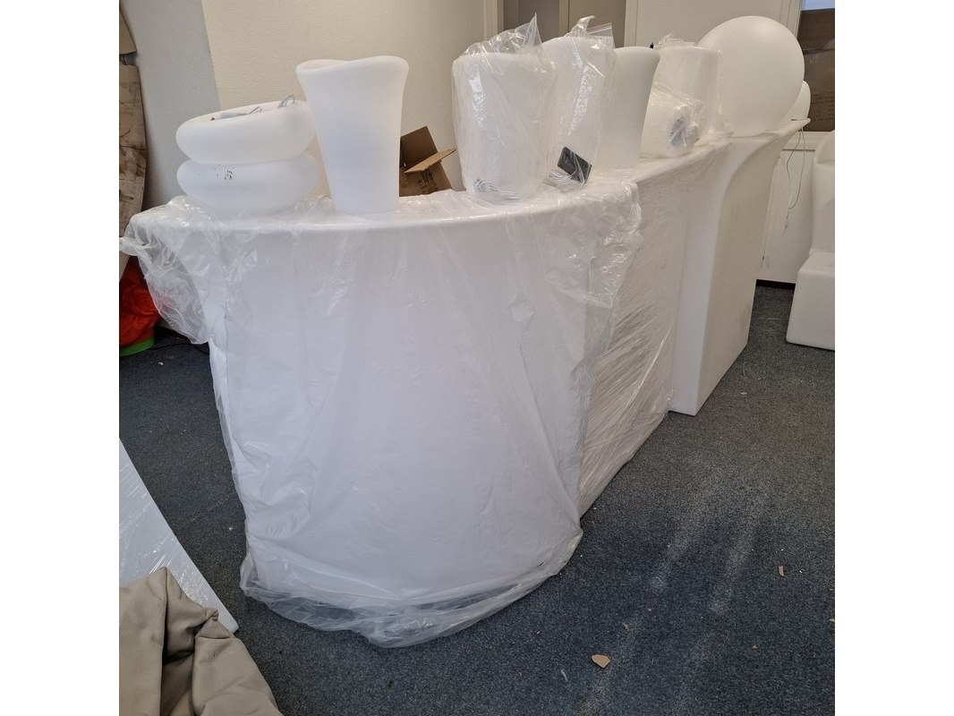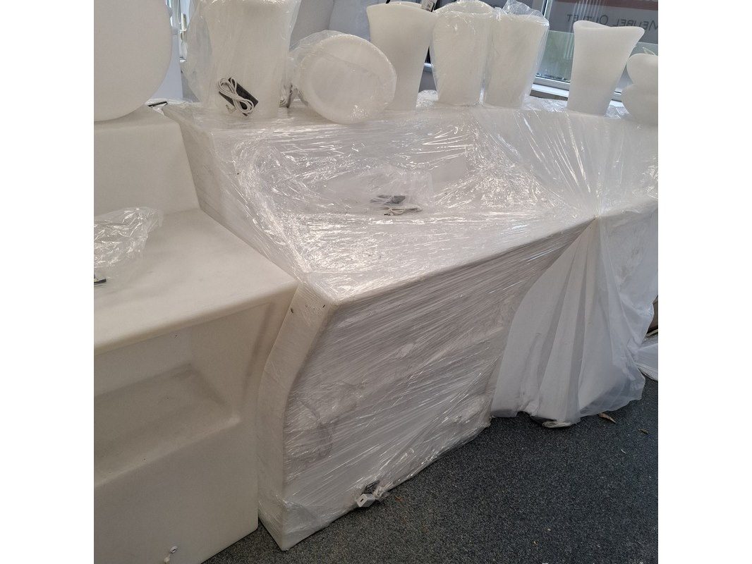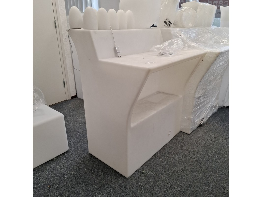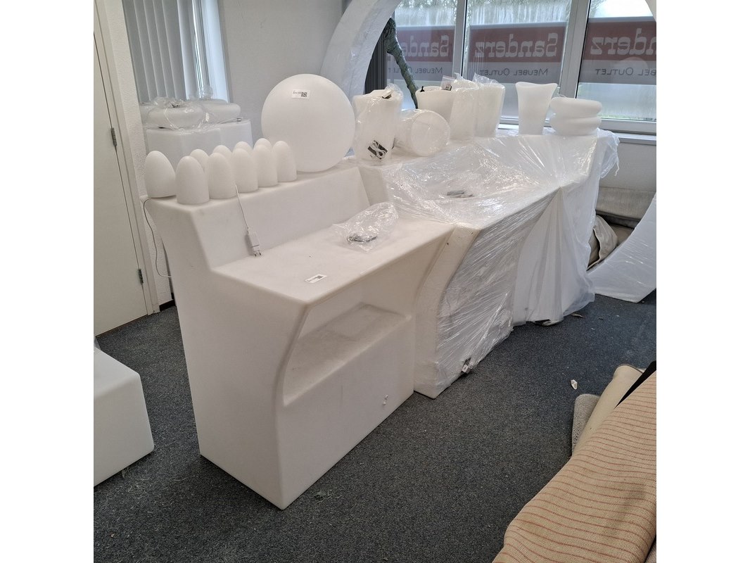Product: 3-delige bar met LED verlichting Kleur: Wit Materiaal: Kunststof Specificaties: 2x recht deel hxbxd ca. 110/90x90x77 cm. 1x hoek deel, hxb ca. 110/90x79. 1x showroommodel en 2x in plastic.