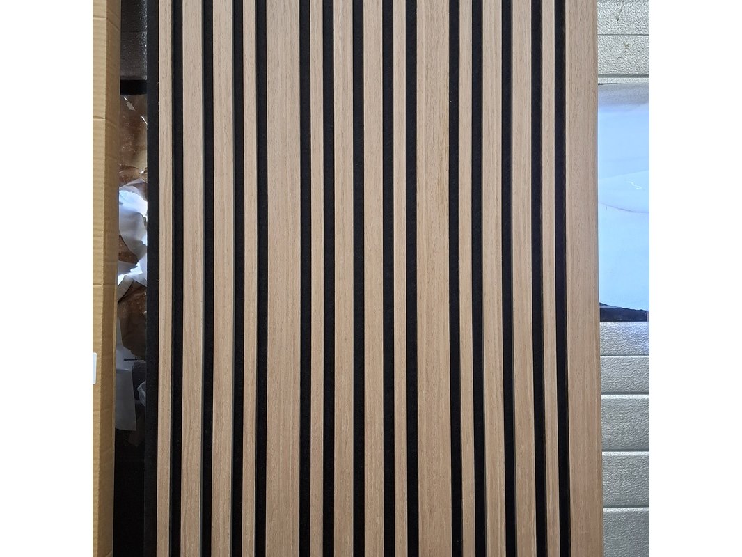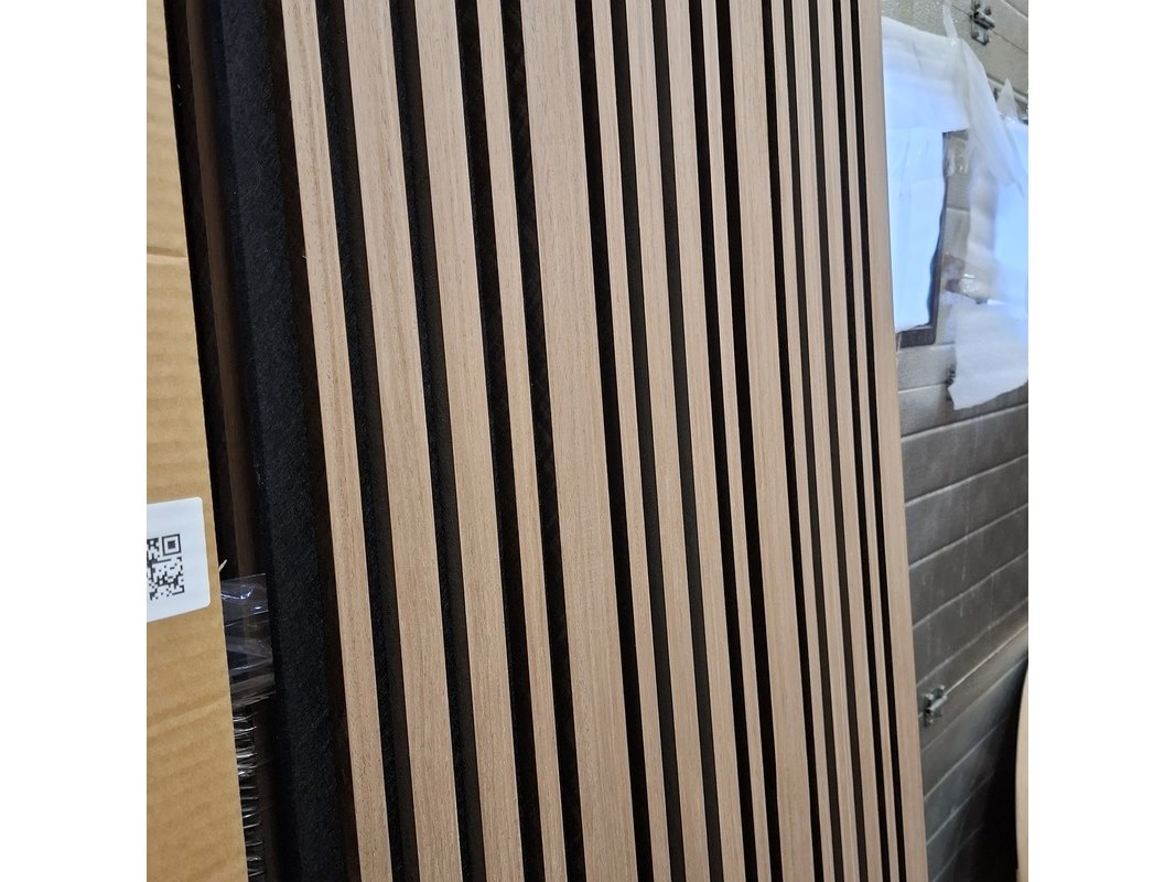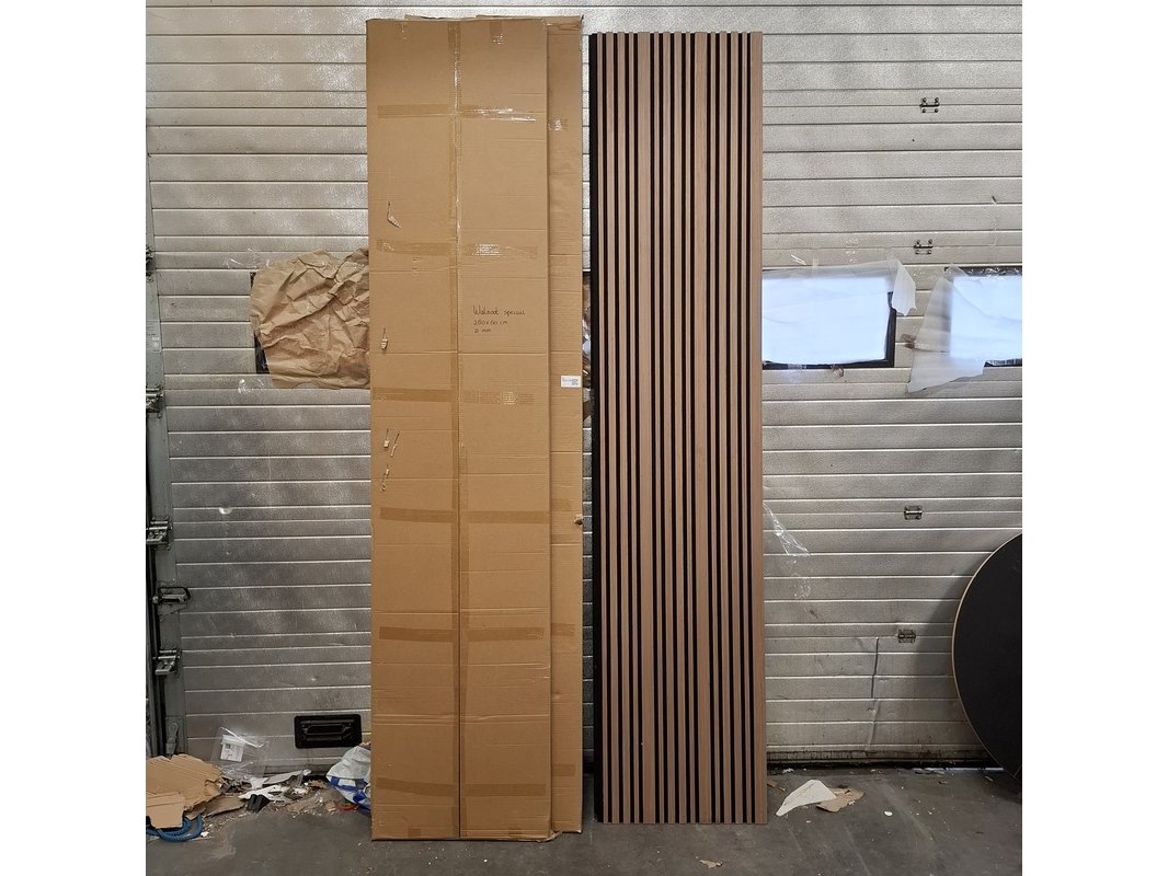Product: Akoetisch wandpaneel Kleur: Walnoot speciaal Afmeting: 280x60 cm, 21 mm Specificaties: 4x in doos en 2x showmodel