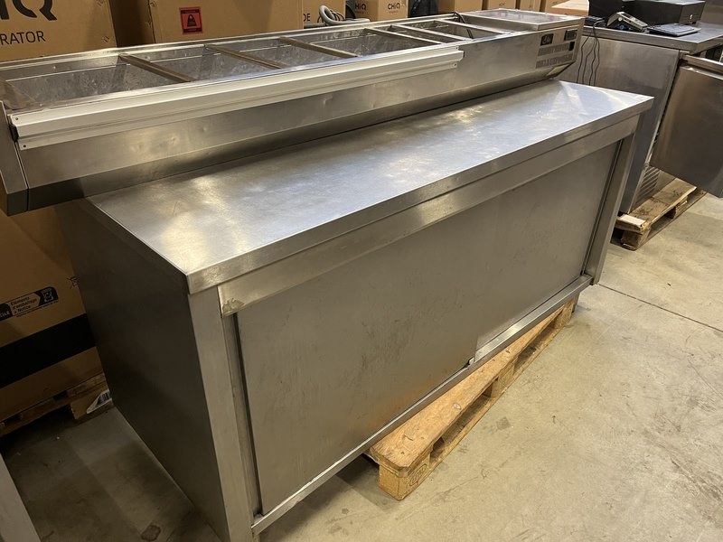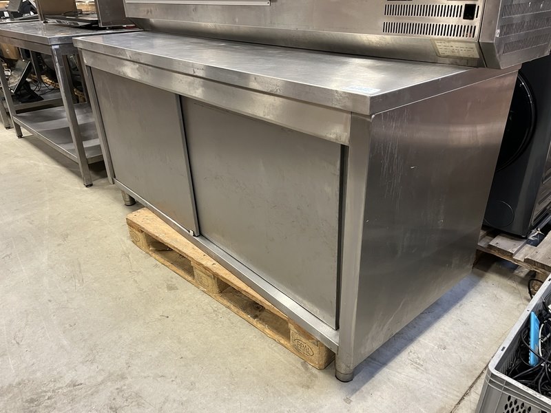 Product: Rvs werktafel met schuifdeuren 180x67x90 cm Conditie: gebruikt Specificaties: 1 poot afgebroken.