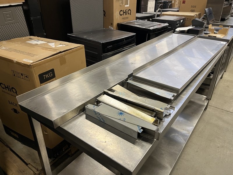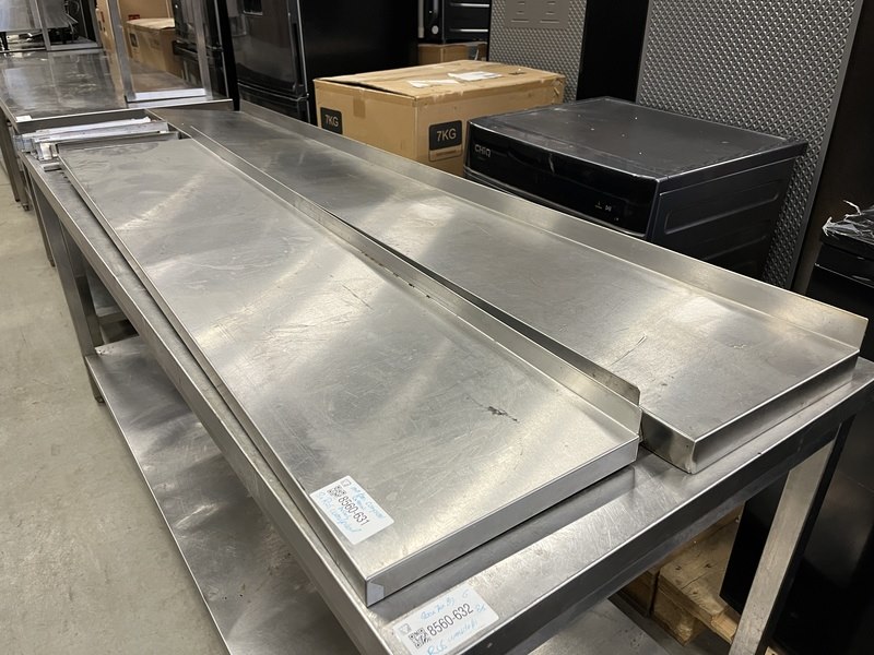 Product: Rvs wandplank (2x 140 cm, 1x 200 cm) Conditie: gebruikt Specificaties: Met bevestigingsmateriaal.