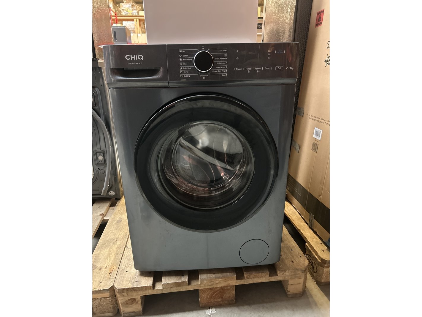 Merk: CHiQ Product: Wasmachine 7 kg AI Smart energieklasse A Afmeting: 600x465x850 mm Specificaties: Demo model.