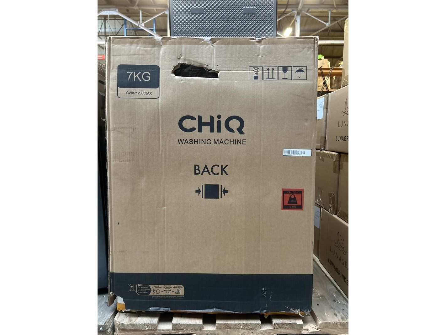 Merk: CHiQ Product: Wasmachine 7 kg AI Smart energieklasse A Afmeting: 600x465x850 mm Specificaties: Showroom model.