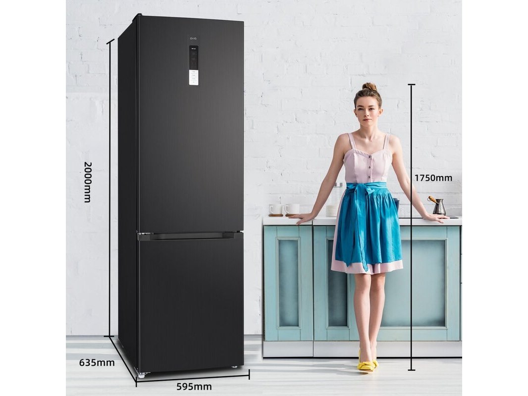 Merk: CHiQ Product: Koel-vriescombinatie 356 liter Afmeting: 595x635x2000 mm Specificaties: Showroom model. Verpakking beschadigd.