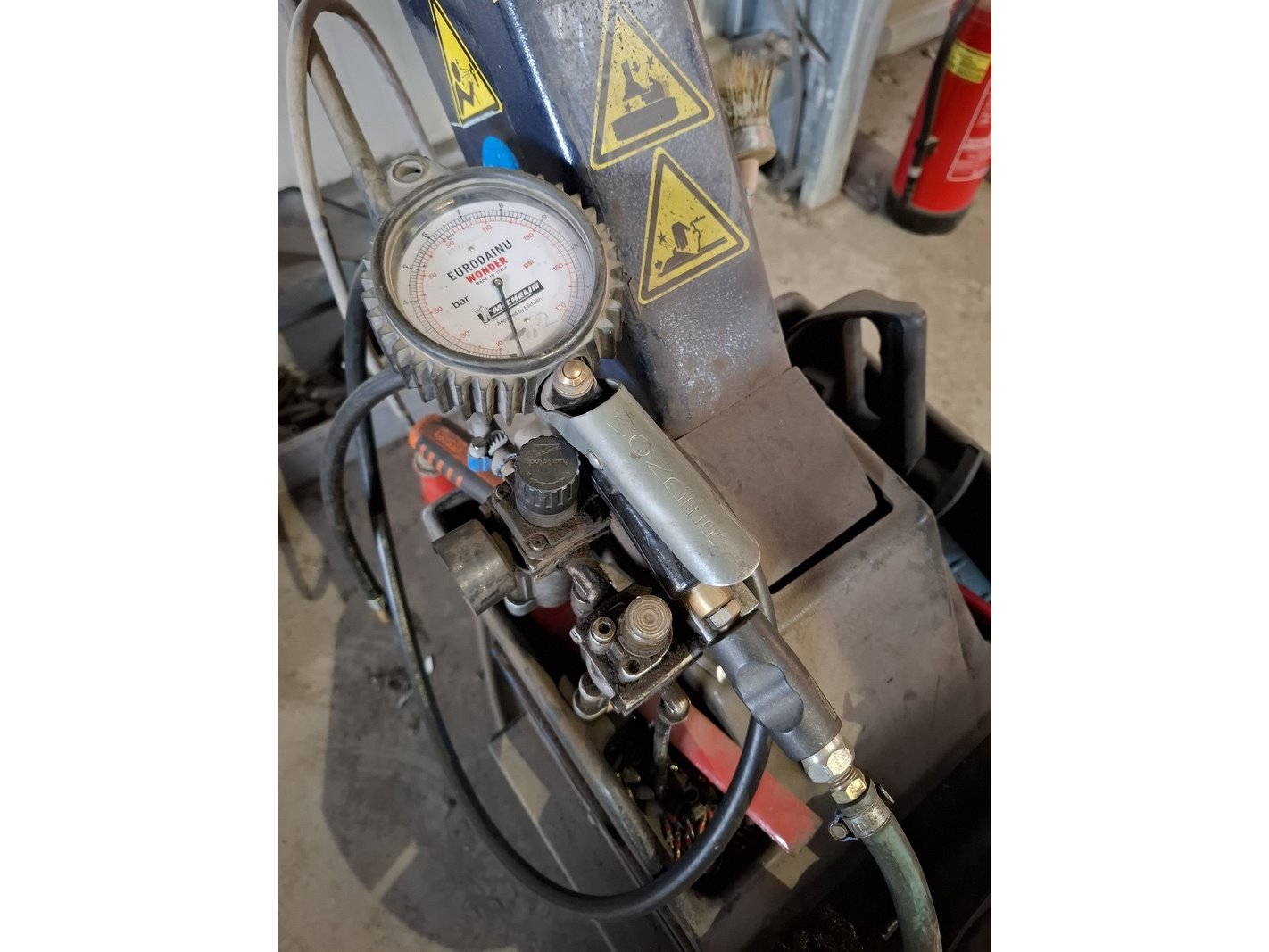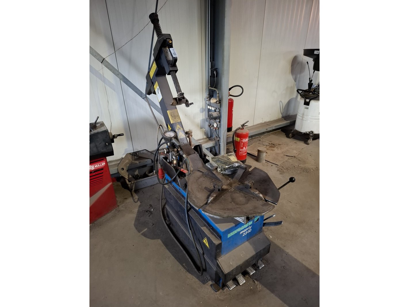 Merk: Hofmann Product: Banden de-en montage apparaat BouwJaar: 1995 Specificaties: 380V, incl. o.a. bandenspanningsmeter, 2 zak nieuwe ventielen