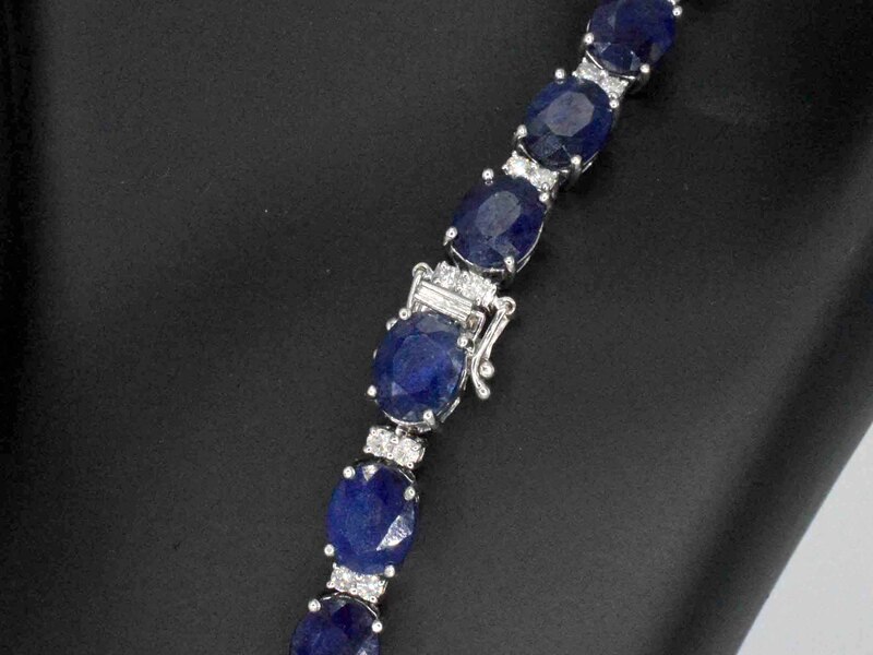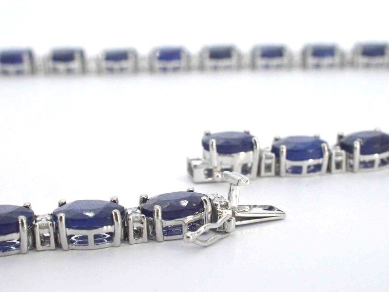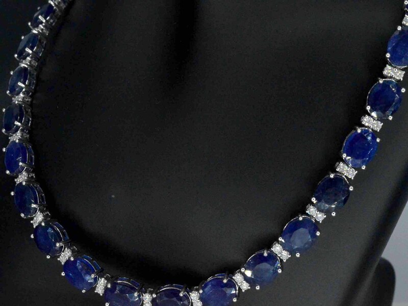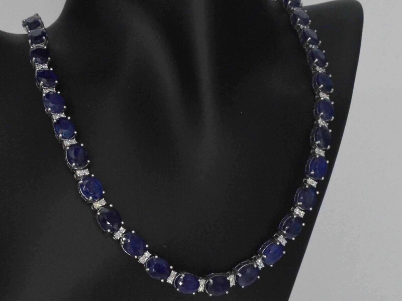 Product: Tenniscollier met grote saffieren en natuurlijke diamanten Specificaties: Diamant: Natuurlijk Aantal: 78 stuks Slijpvorm: Briljant geslepen Gewicht (carat): 3.00 carat Kleur: F-G Zuiverheid: SI-P Slijpkwaliteit: Zeer mooi Edelsteen: Saffieren Aantal: 39 stuks Slijpvorm: Ovaal geslepen Gewicht (carat): 115.00 carat Kleur: Saffier blauw Zuiverheid: Met natuurlijke insluitsels (enhanced) Juweel: Halsketting Gewicht: 57 gram Afmetingen/lengte: 47 cm Materiaal: 9K goud (375) bwgg Conditie: Nieuw Verpakking: Luxe sieradendoos Toelichting: De kwaliteit is overgenomen van het rapport behorend bij item. De waardebepaling is een beoordeling van een gecertificeerde diamantair, gebaseerd op consumentenprijzen. Consumentenprijs: € 22.978,-
