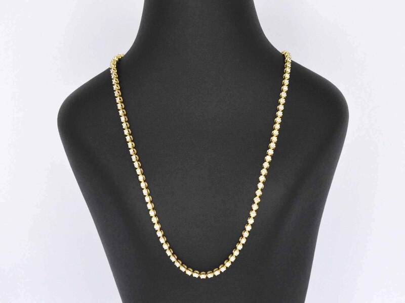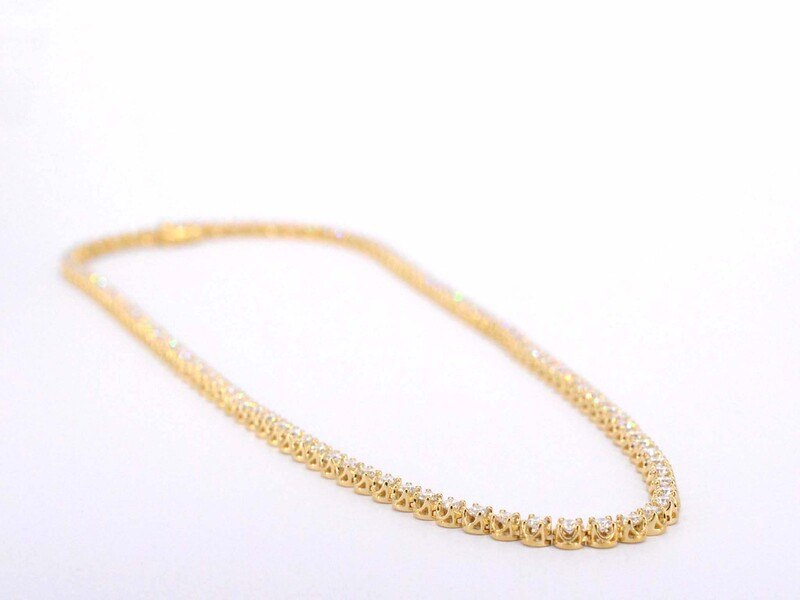 Product: Gouden collier met 107 briljant geslepen diamanten Specificaties: Diamant: Natuurlijk Aantal: 107 stuks Slijpvorm: Briljant geslepen Gewicht (carat): 6.00 carat Kleur: F-G Zuiverheid: VS Slijpkwaliteit: Zeer mooi Juweel: Collier Gewicht: 22 gram Afmetingen/lengte: 41,5 cm Materiaal: 18K goud (750) Conditie: Nieuw Verpakking: Luxe sieradendoos Toelichting: De kwaliteit is overgenomen van het rapport behorend bij item. De waardebepaling is een beoordeling van een gecertificeerde diamantair, gebaseerd op consumentenprijzen. Consumentenprijs: € 33.775,-