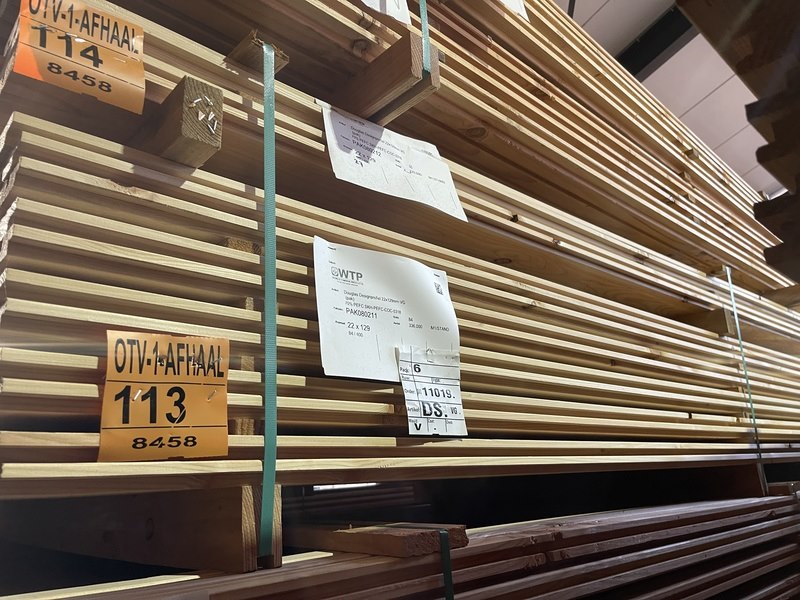 Product: Douglas Design- Triple- Deens profiel Materiaal: Douglas Afmeting: 22x142mm, lengte 400cm Conditie: nieuw