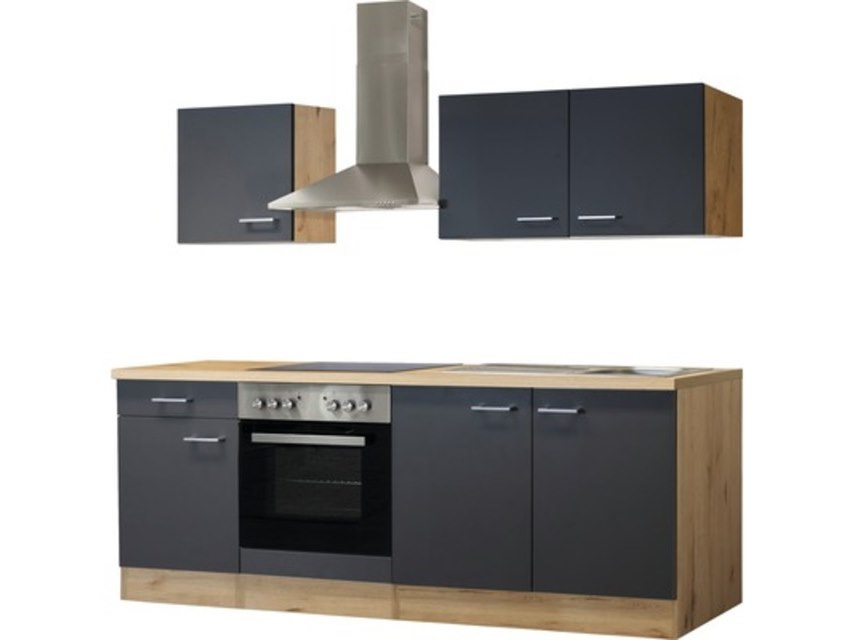 Product: Design keuken met apparatuur Kleur: Antraciet Afmeting: 210x60cm Conditie: nieuw Specificaties: Type artikel: Keuken met apparaten Uitvoering: Keuken Variant: Spiegelbaar (links en rechts te monteren) Montagewijze: Gedemonteerd Serie: Tiago Breedte: 210 cm Diepte: 60 cm Werkhoogte: 85 cm Kleurfamilie: Grijs Frontkleur: Basalt grijs Oppervlak front: Mat Materiaal front: Spaanplaat Uitvoering fronten: Melamine Kleur greep: Aluminium-look Vorm handgreep: Beugelgreep Korpuskleur: San Remo eiken licht Oppervlakte corpus: Mat Materiaal Korpus: Spaanplaat Kleur werkblad: San Remo eiken licht Dikte werkblad: 28 mm Inbegrepen keukenkasten: Onderkast met deur en schuiflade 50 cm, Ombouwkast voor fornuis met vaste panelen, Onderkast voor spoelbak 100 cm, Hangkast 100 cm, Hangkast 50 cm Lade-uitvoering Met kogellagers en een spaanplaatrand Electro apparatuur inbegrepen Glas keramische kookplaat, Inbouw-fornuis-set, Afzuigkap Detailbeschrijving keukenmeubel De 210 cm brede keuken bestaat uit: 1 onderkast 50 cm - 1 lade - 1 draaideur - 1 plank 1 ovenombouwkast 60 cm - 1 plint - 1 nis voor inbouwfornuis 1 spoelkast 100 cm - 2 draaideuren 1 bovenkast 50 cm - 1 plank - 1 draaideur - hoogte 54,8cm 1 bovenkast 100cm - 1 plank - 2 draaideuren - hoogte 54,8 cm1 werkblad 210x60 cm