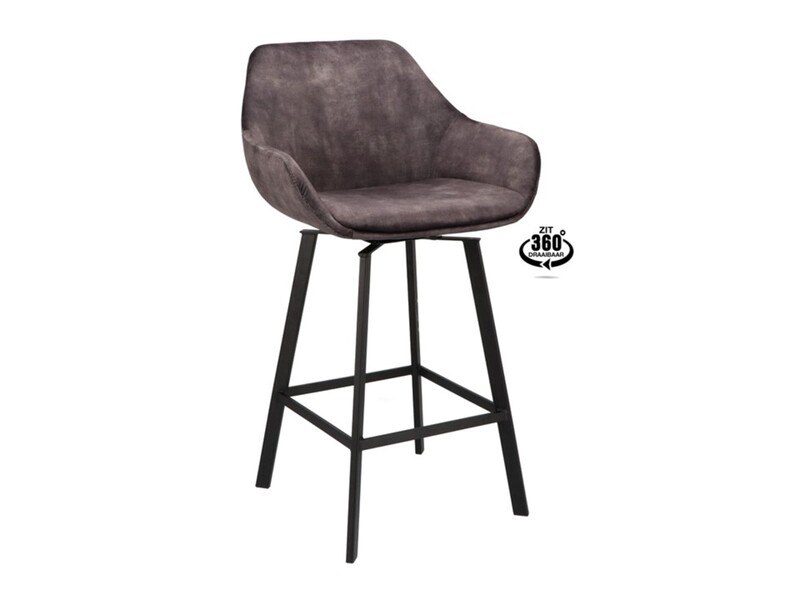 Product: Luxe roterende barkruk Kleur: Adore Antraciet Conditie: nieuw Specificaties: Breedte: 48cm Diepte: 54cm Hoogte: 90cm Zitdiepte: 37cm Zithoogte: 65cm Zitbreedte: 36cm Armhoogte 74 Materiaal: Adore velvet en stalen poten