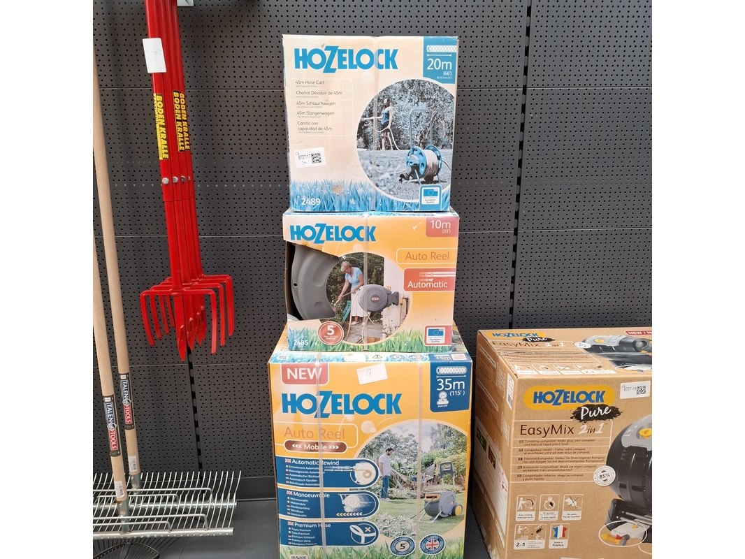 Merk: Hozelock Product: Tuinslanghaspel Afmeting: 1x lengte haspel 20m, 1x lengte haspel 10m en 1x lengte haspel 35m.