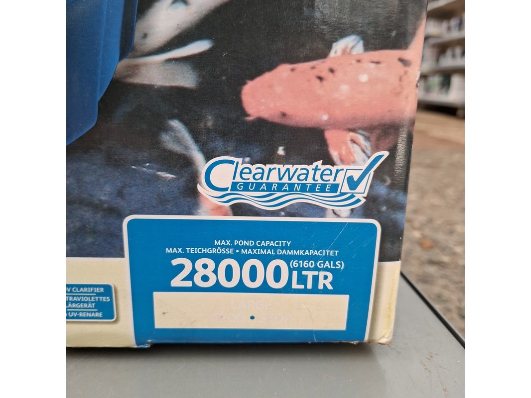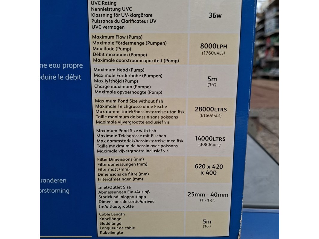 Merk: Hozelock Product: Vijver filter Afmeting: Hxbxd ca. 62x42x40 cm. Specificaties: 36W, maximale doorstroomcapaciteit 8000LPH.