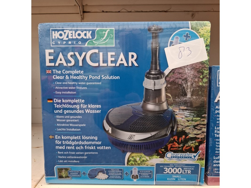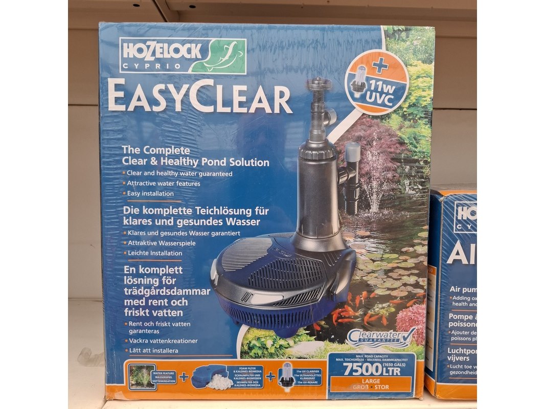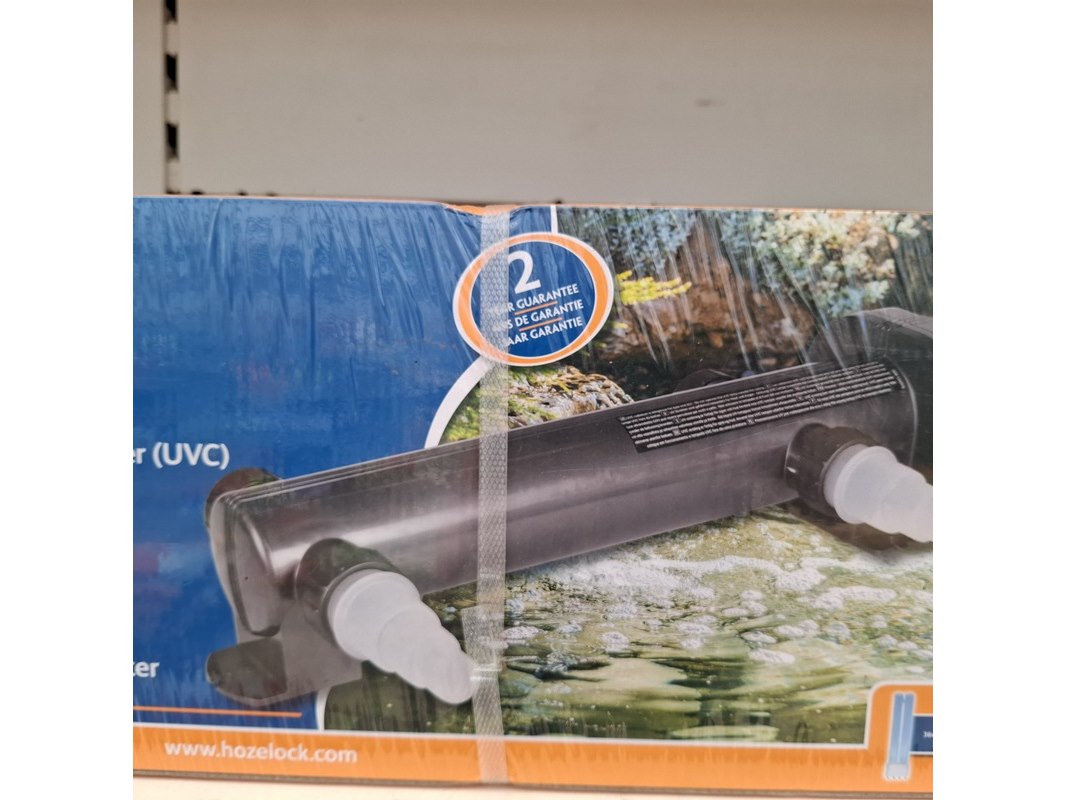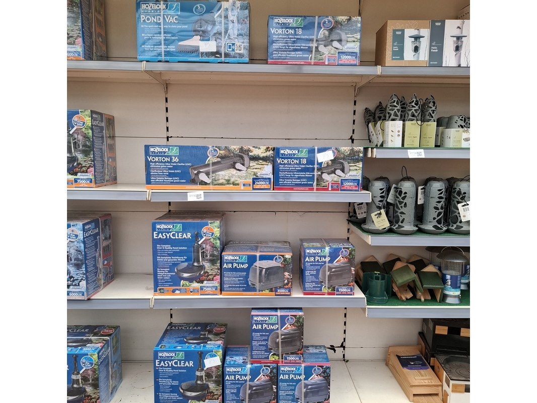 Merk: Hozelock Product: Assortiment vijver benodigdheden Specificaties: Bestaande uit o.a. vijver stofzuiger, UV reinigers, filterpompen, luchtpompen etc. In 1 meter stelling.